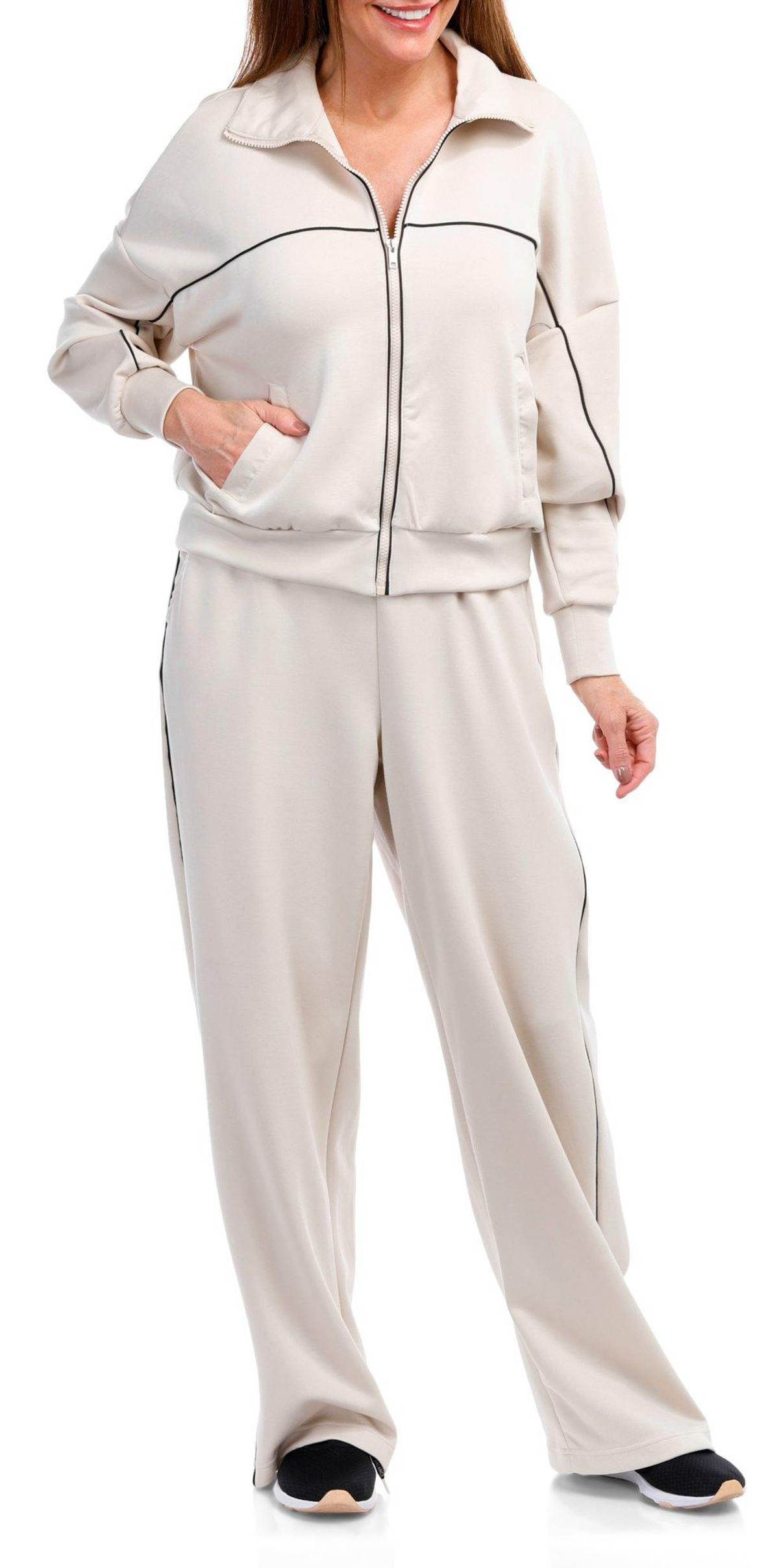 Elevate your activewear with this 2-piece Active Jacket and Sweatpants Set. Crafted from soft scuba fabric, this set offers unparalleled comfort and style. The full-zipped jacket features double front pockets, perfect for keeping essentials close. Matching sweatpants with double front pockets ensure functionality and a sleek look. Fabrication is 45% polyester, 45% rayon, 10% spandex.