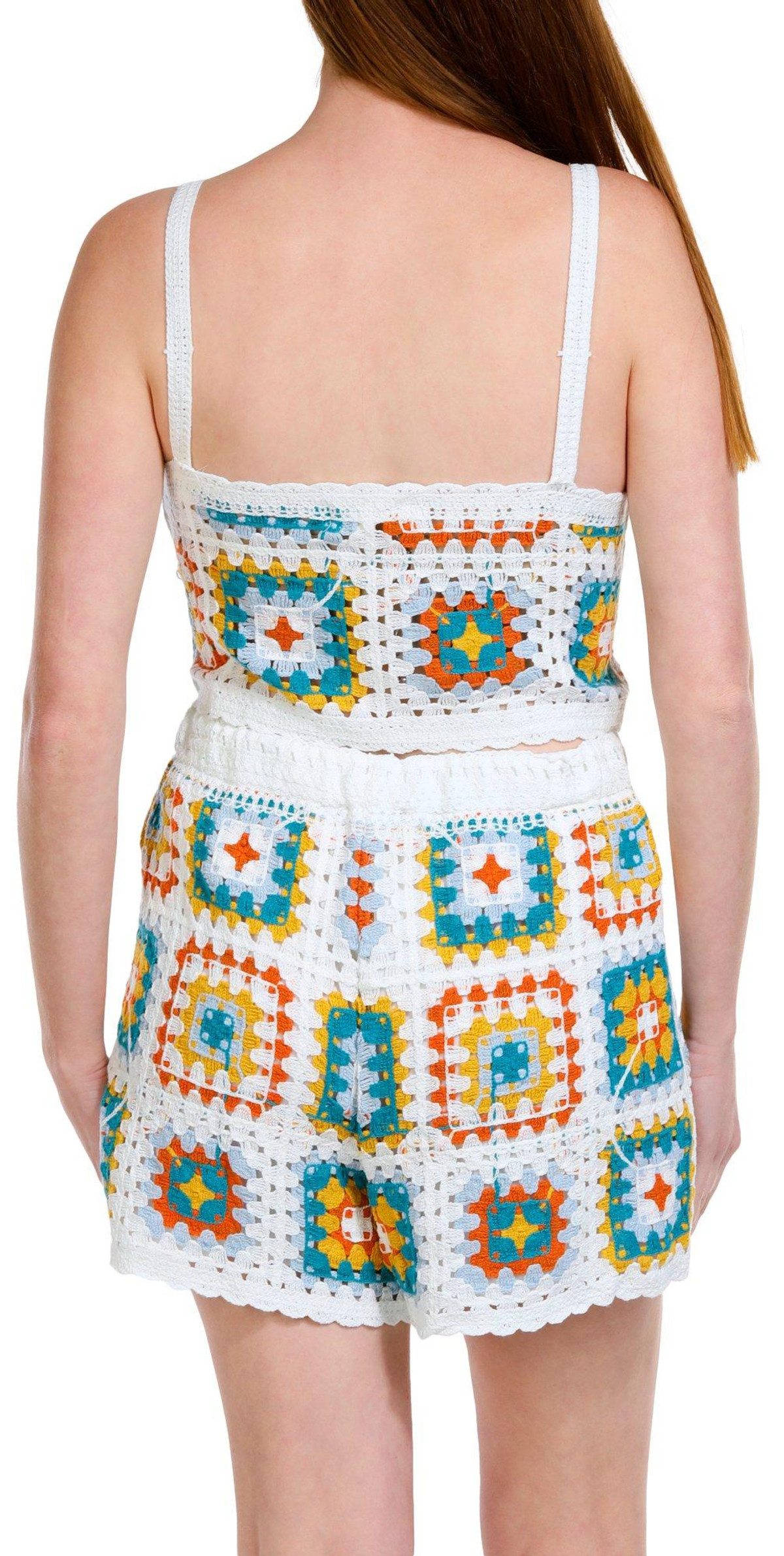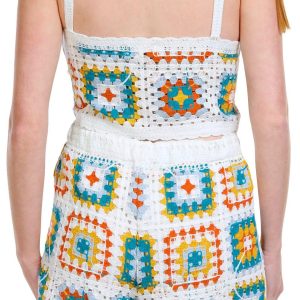 Introducing the Juniors 2 Pc Crochet Crop Top Set, a perfect blend of comfort and style. Made from a mix of cotton and acrylic, this set includes a sleeveless crochet crop top and matching shorts, both featuring a vibrant multicolored design. Ideal for sunny days, this trendy ensemble adds a playful touch to your wardrobe. Elevate your summer look with this chic and eye-catching crochet set!
