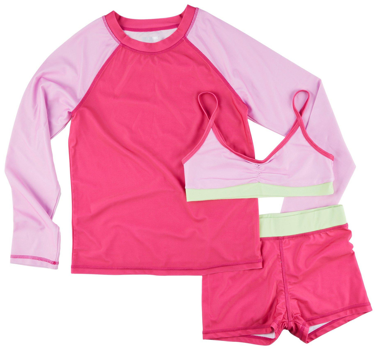 Keep your little ones stylish and protected with this Girls 3-piece Swimsuit Set! This adorable set features fun Colors patternand solid and includes a long sleeve top, Bikini Top and matching shorts, offering excellent sun protection for those long beach days. Fabrication is 85% polyester, 15% spandex.