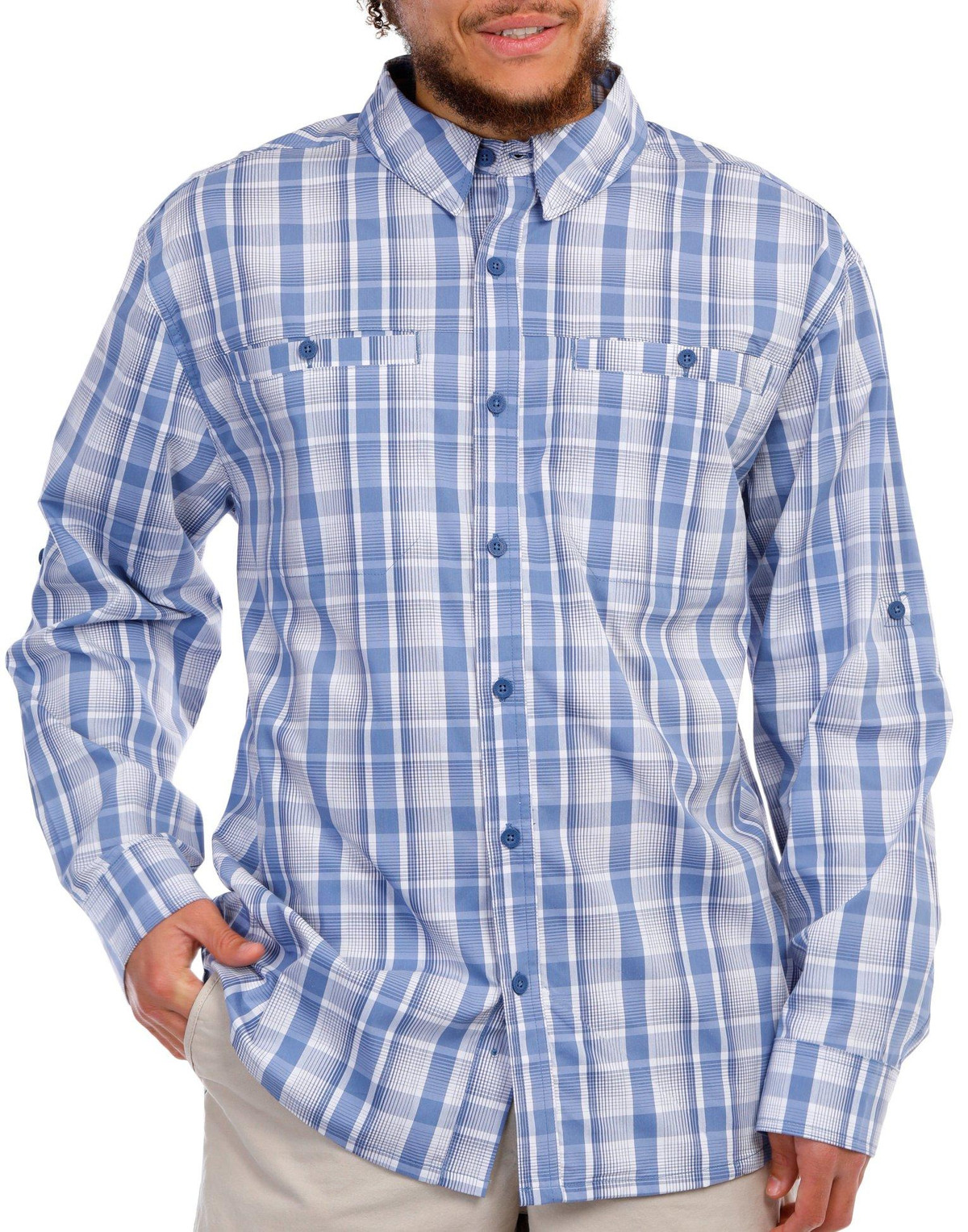 The Men’s Long Sleeve Terrain Button Down Shirt, crafted from a blend of cotton, polyester, and spandex, offers a comfortable and flexible fit. Featuring a stylish plaid print, this shirt is designed with a classic collared neckline, practical chest pockets, and roll tab sleeves for added versatility. Perfect for both casual and semi-formal occasions, this piece adds a touch of rugged elegance to any wardrobe.