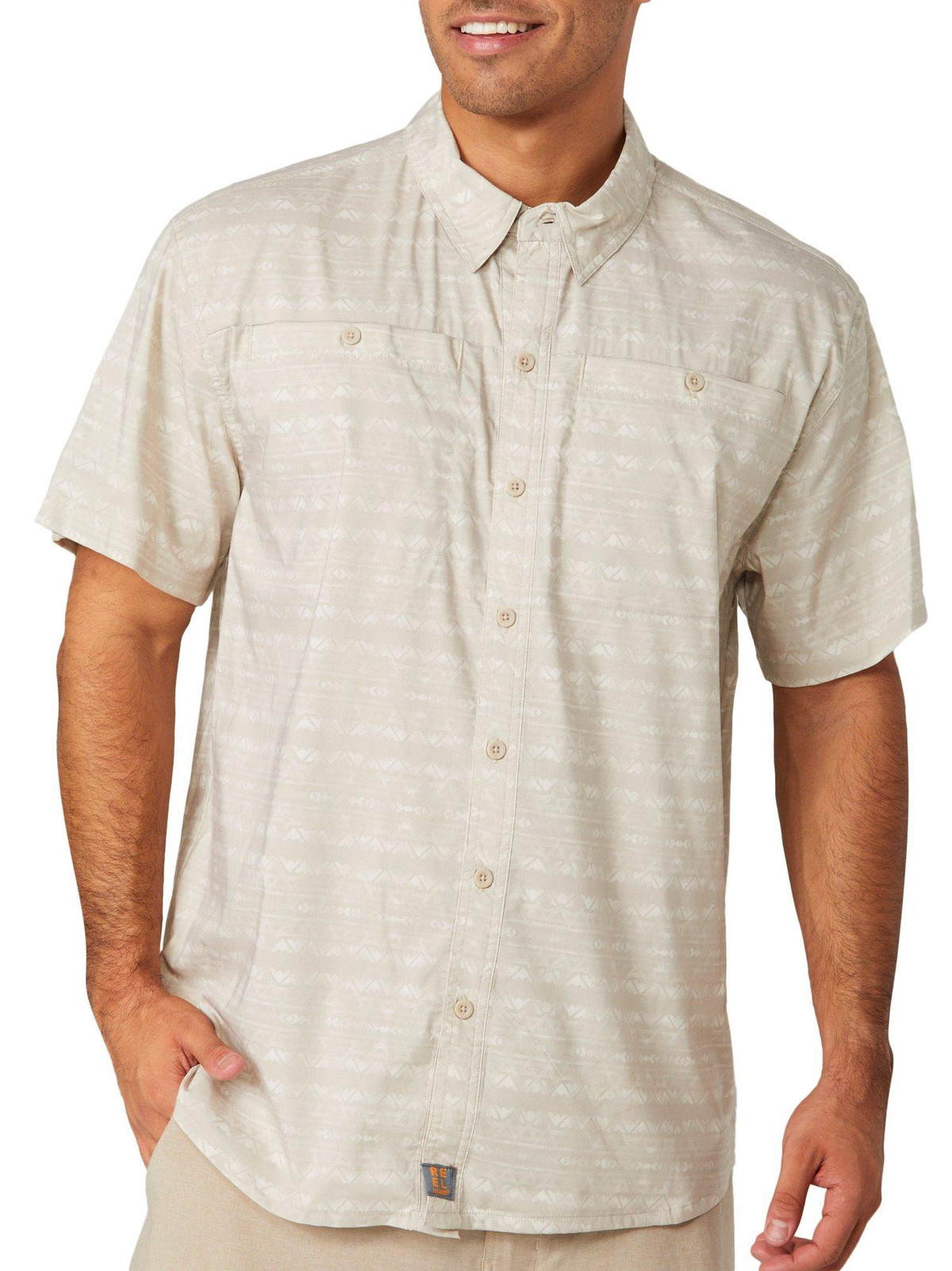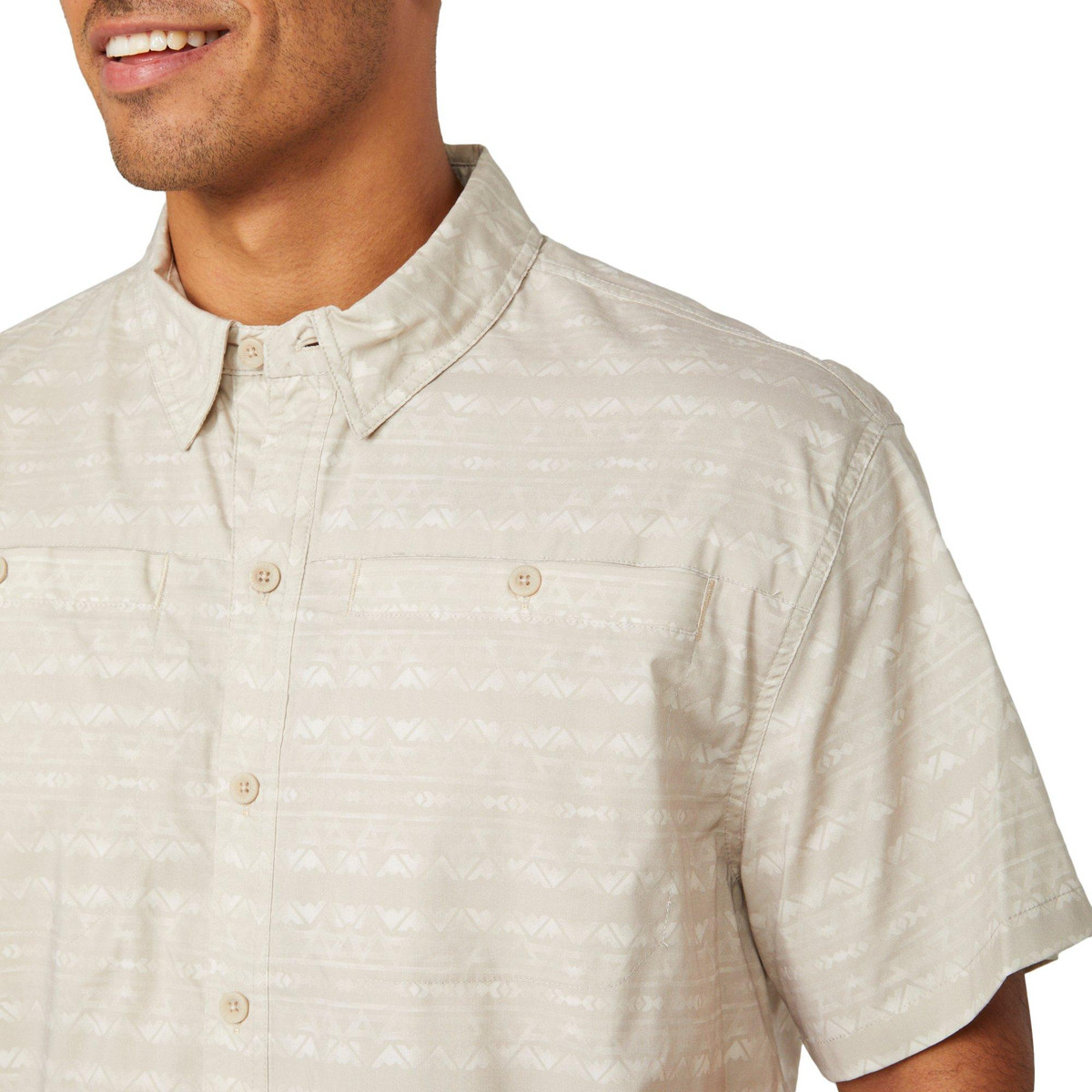 Conquer the outdoors in style with the Terrain Short Sleeve Shirt. Featuring a bold print pattern, buttoned front, and vented panels for breathability, its built for adventure. Integrated sun protection shields you from the elements, while a hidden sunglasses cleaner keeps your view crystal clear. Fabrication 75% polyester, 22% cotton, 3% spandex.