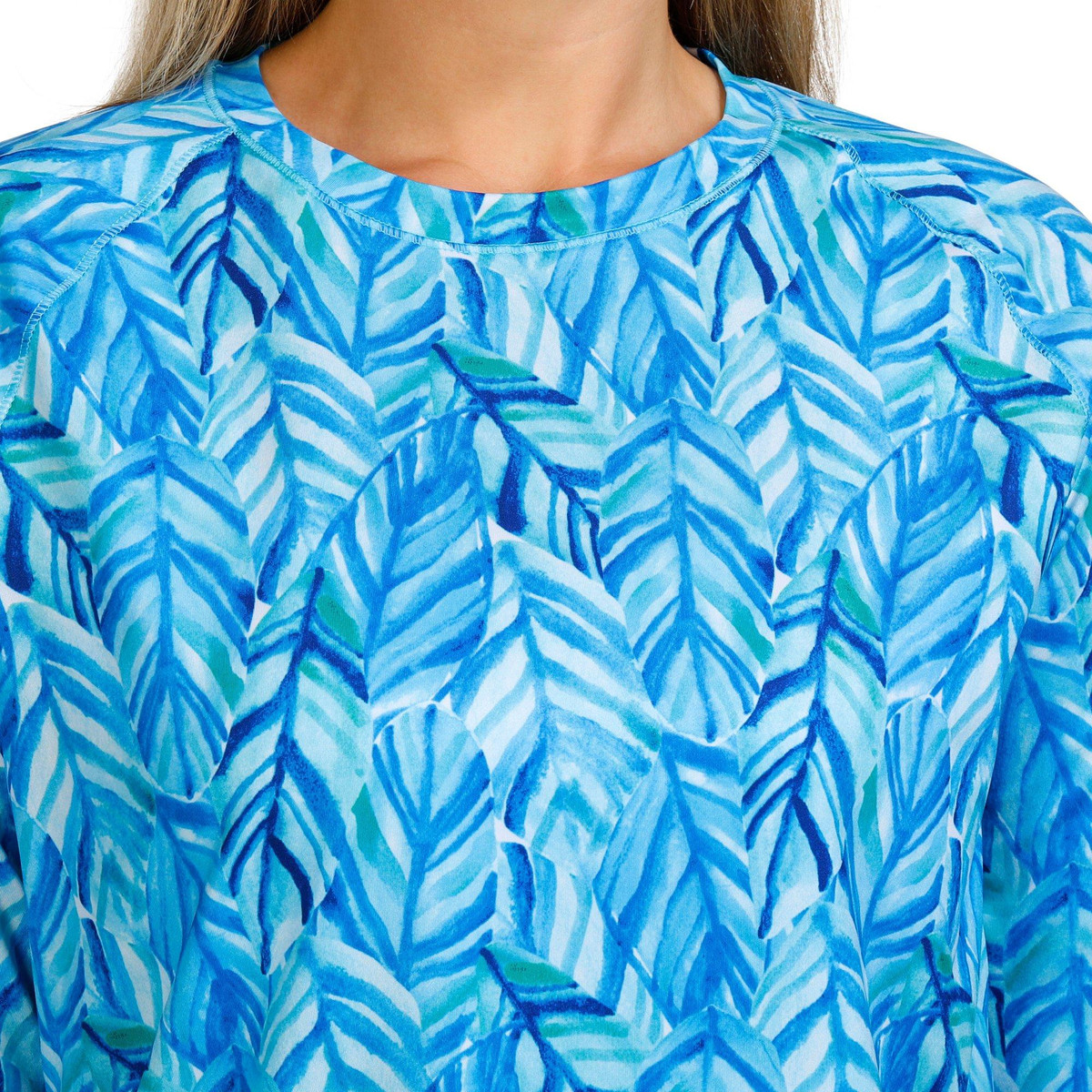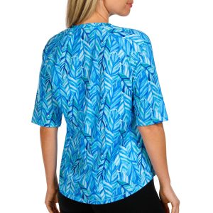 Discover the outdoors in this top! The palm leaf print design exudes coastal charm. Made from soft, lightweight stretch knit fabric, this top ensures maximum comfort and flexibility for all your outdoor adventures. A round neckline adds a touch of classic style, making it perfect for both active and casual wear. Embrace the outdoors in style with this versatile and elegant piece. Fabrication is 92% recycled polyester, 8% spandex.