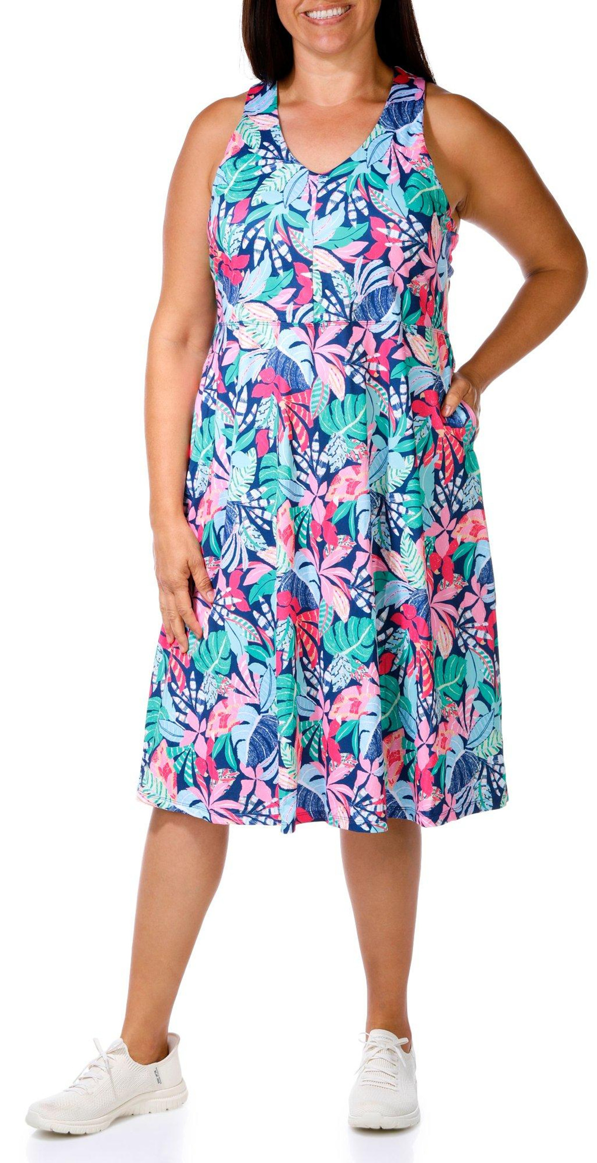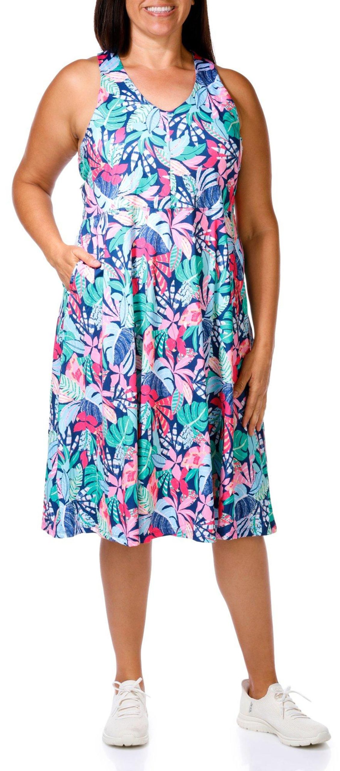 The Plus Active Floral Print Dress offers a perfect blend of comfort and style. Made from a soft and stretchy blend of 88% polyester and 12% spandex, this dress provides a flattering fit that moves with you and features performance stretch, UPF 50 protection, moisture wicking, cooling tech, quick dry and a built in bra.