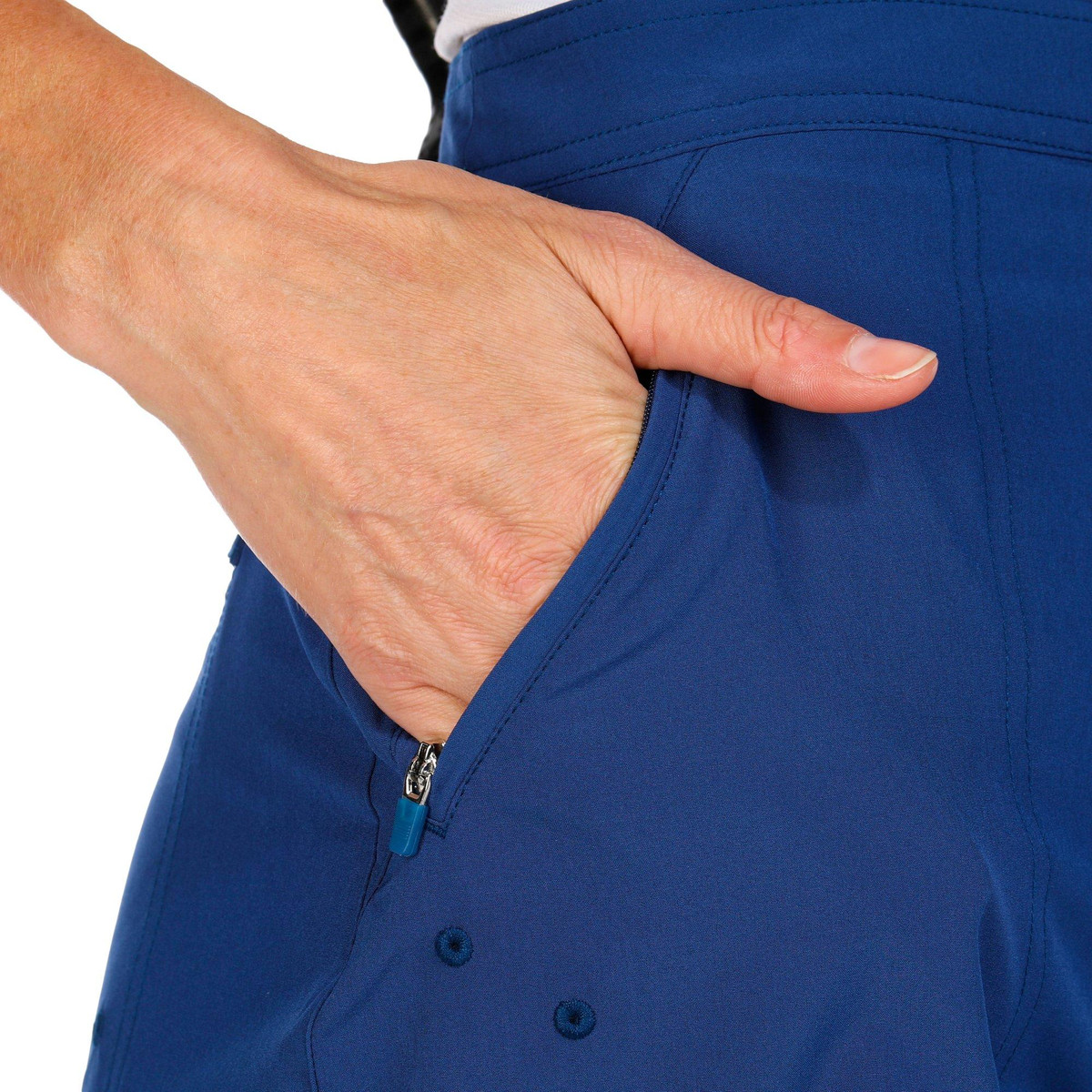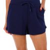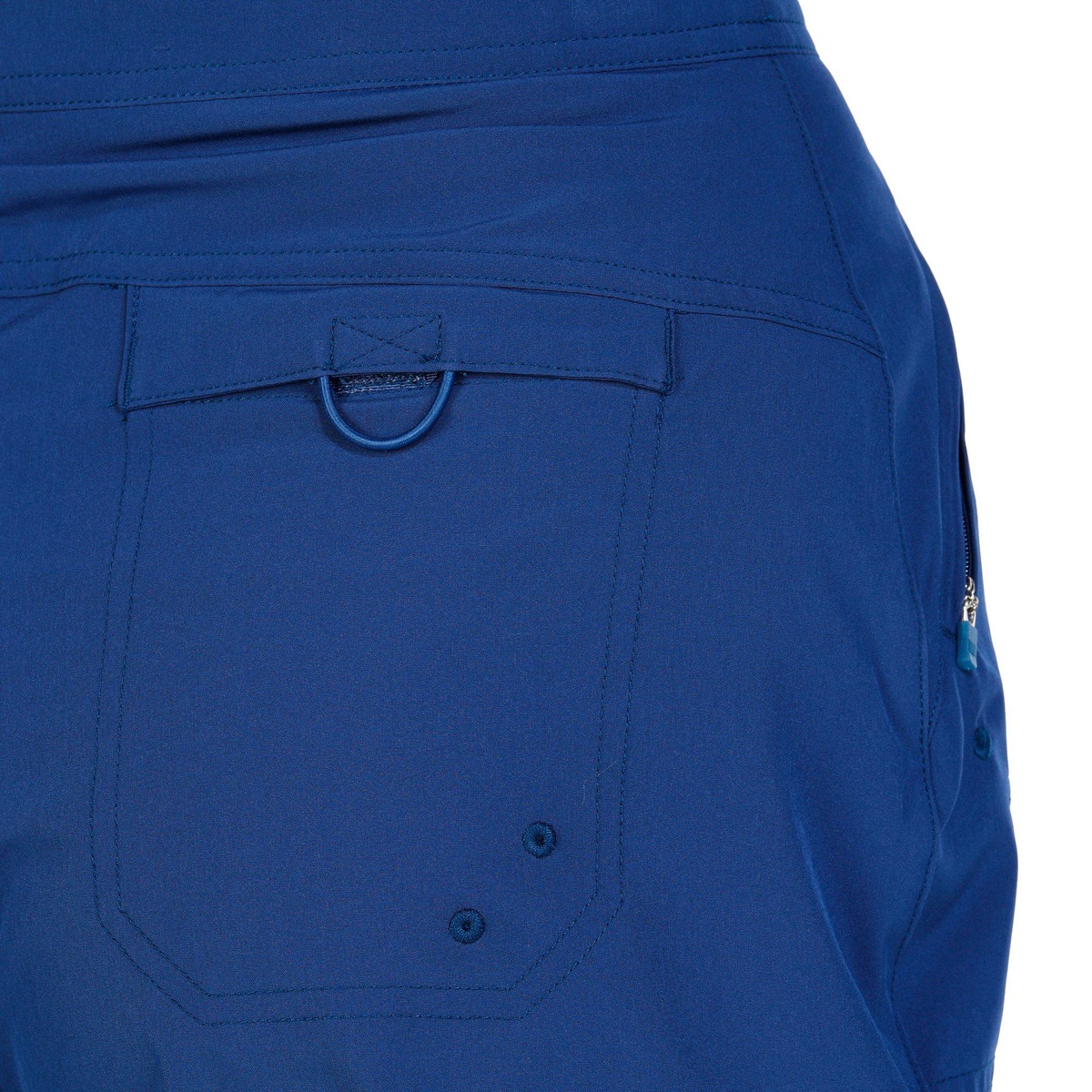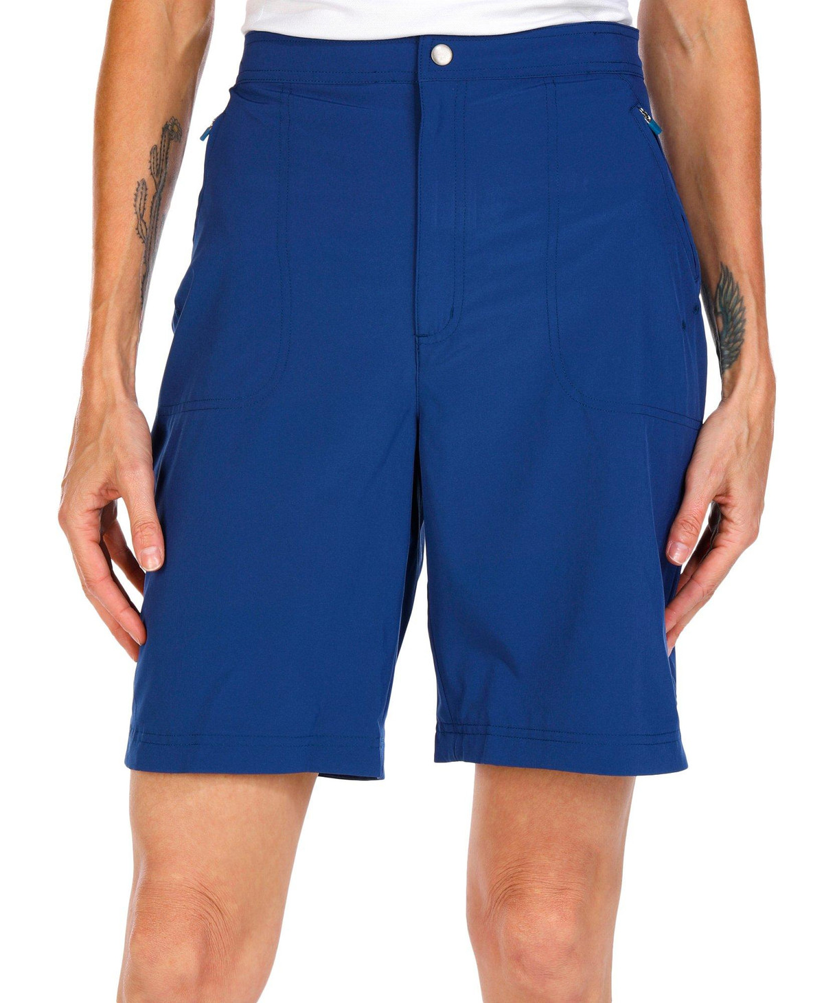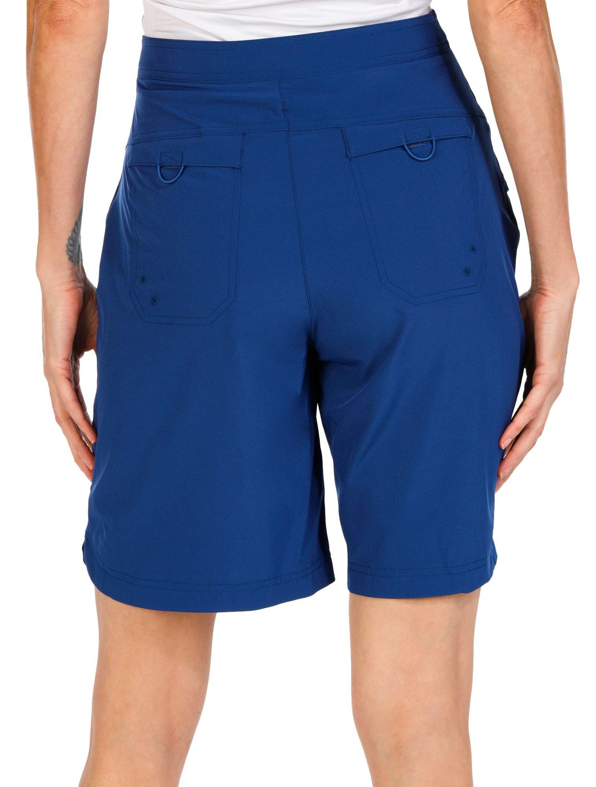 These pull-on short features a solid color design on lightweight textured ribbed woven fabric, two snap buttons and zip closure, two side zip pockets, one back zip pocket, belt loops with elastic back waistband, UPF 50 sun protection and snag resistant. Outseam measures approximately 16 in. Inseam measures approximately 5 inches. Fabrication 95% nylon, 5% spandex for the body and 86% polyester and 14% spandex for the waistband.