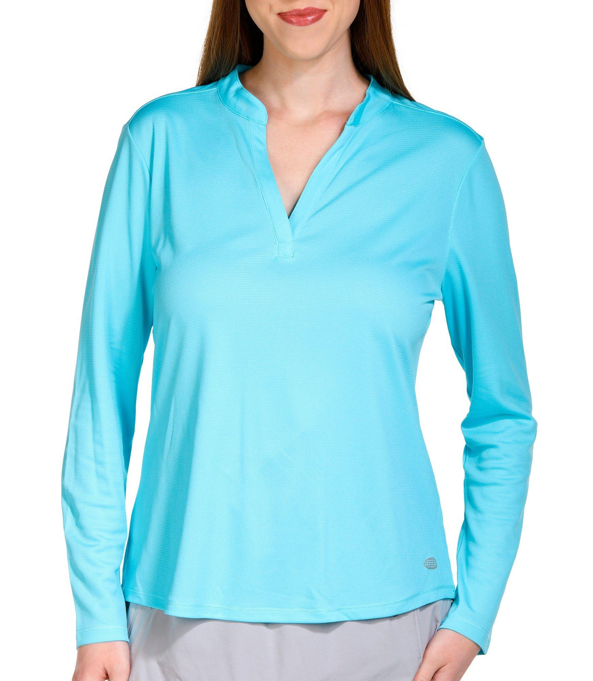 The Women’s Solid Freeline Mandarin Long Sleeve Top offers both style and functionality. Featuring a flattering v-neckline with a mandarin collar, this top has a hi-low hemline for a modern, relaxed look. Made from 100% polyester, it provides a comfortable fit and measures approximately 23 inches in length. With built-in UPF 30 sun protection, this top is perfect for staying cool and protected during outdoor activities. Ideal for casual wear, it combines comfort, style, and sun safety.