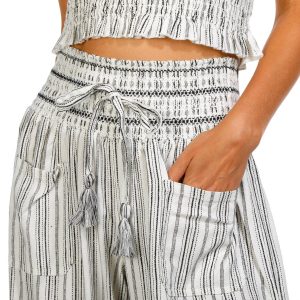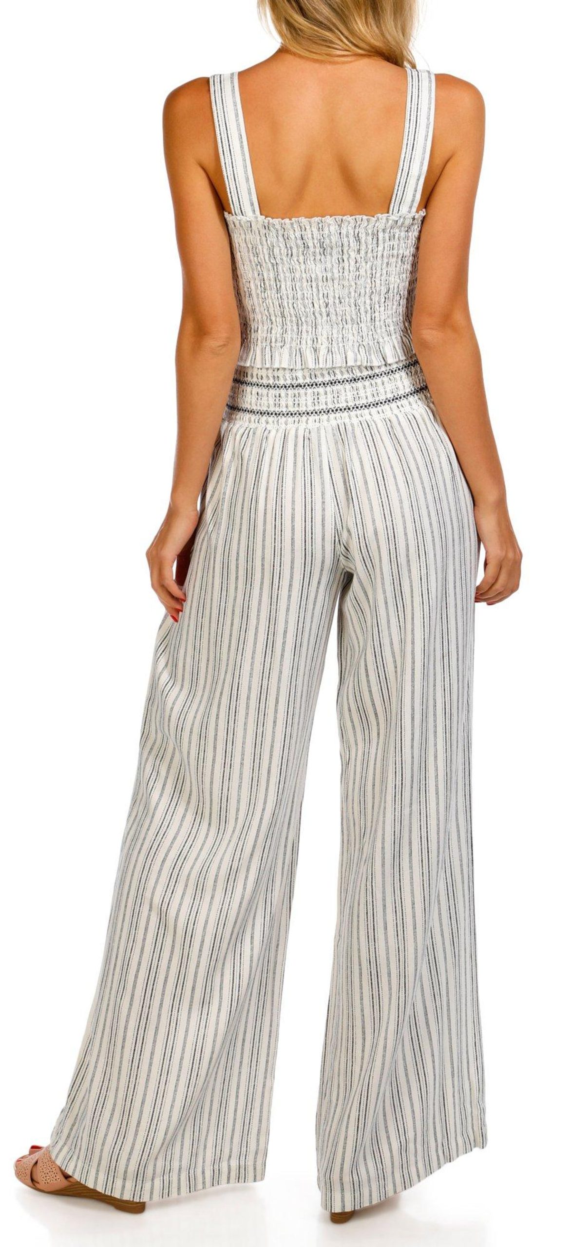 Introducing our Juniors 2 Pc Stripe Smock Pants Set, crafted from a blend of cotton, linen, and rayon. This stylish set features a chic striped print and includes a sleeve crop top with an all-over smocked design and a square neckline. The matching pants boast a smocked waistband, front pockets, and a drawstring waistband for added comfort.