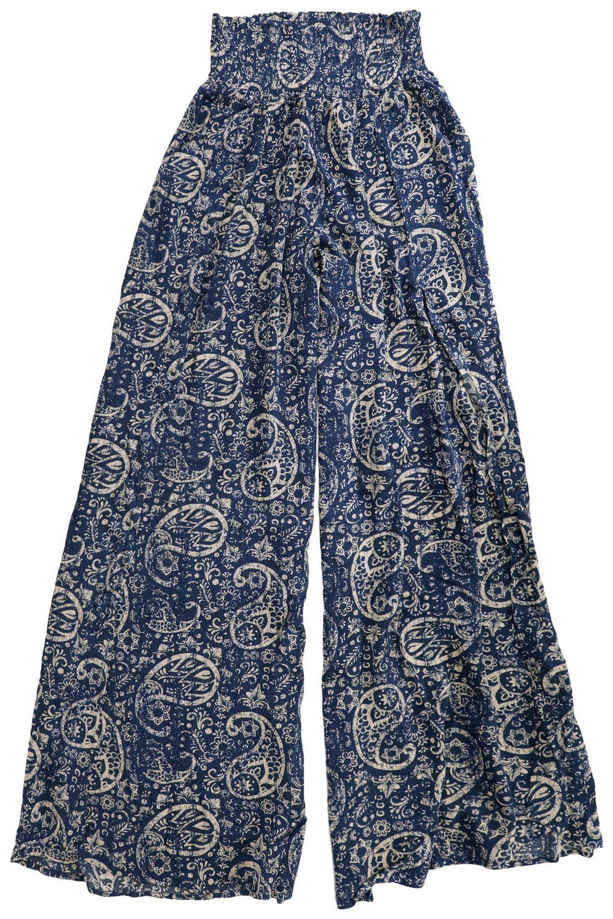 Breeze through your day in these Juniors Paisley Wide Leg Pants. Featuring a smocked waistband for all-day comfort, a flowy wide-leg silhouette, and chic side slits, they are perfect for effortless style with a touch of flair. Fabrication 100% rayon