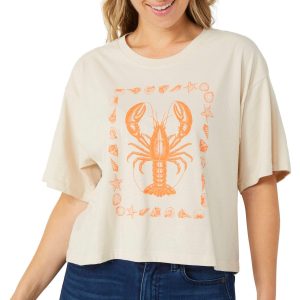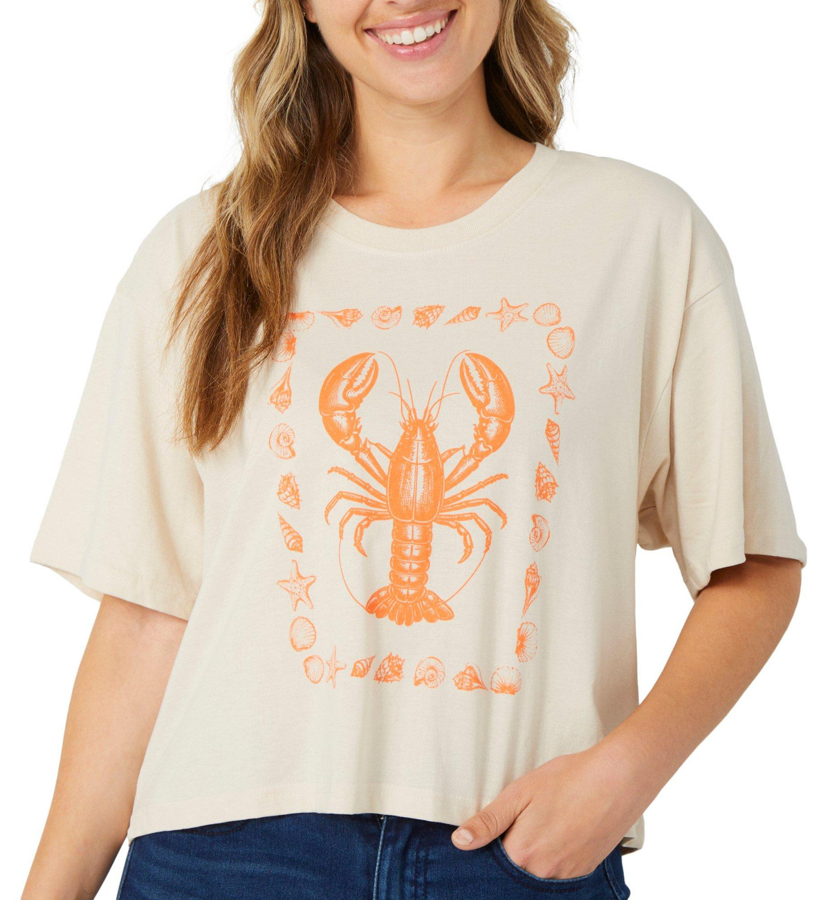 Embrace sunny vibes with this Juniors Lobster Graphic Crop T-Shirt. Made from a premium blend of cotton and polyester, this tee features a lobster and seashells graphic design, short sleeves, a classic crew neckline and a stylish cropped length. Perfect for casual outings or beach days, this t-shirt combines comfort and style effortlessly, making it a versatile addition to your summer wardrobe. Fabrication is 60% cotton, 40% polyester. Top length measures approximately 22 in.