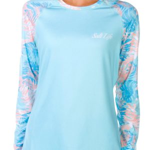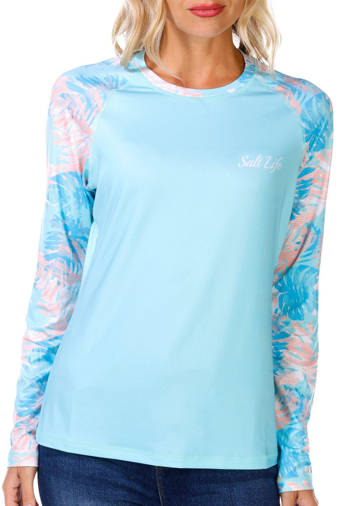 Juniors Long Sleeve On Holiday Performance Top blends tropical style with active comfort. Featuring a vibrant print, crew neckline, and long sleeves, it offers UPF 30 protection, moisture wicking, antimicrobial properties, and performance stretch for all day wear. Fabrication 88% polyester, 12% spandex