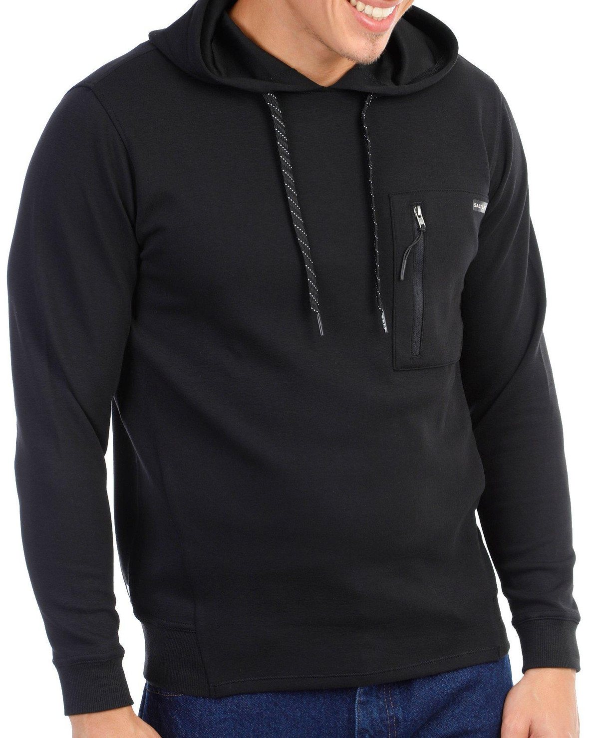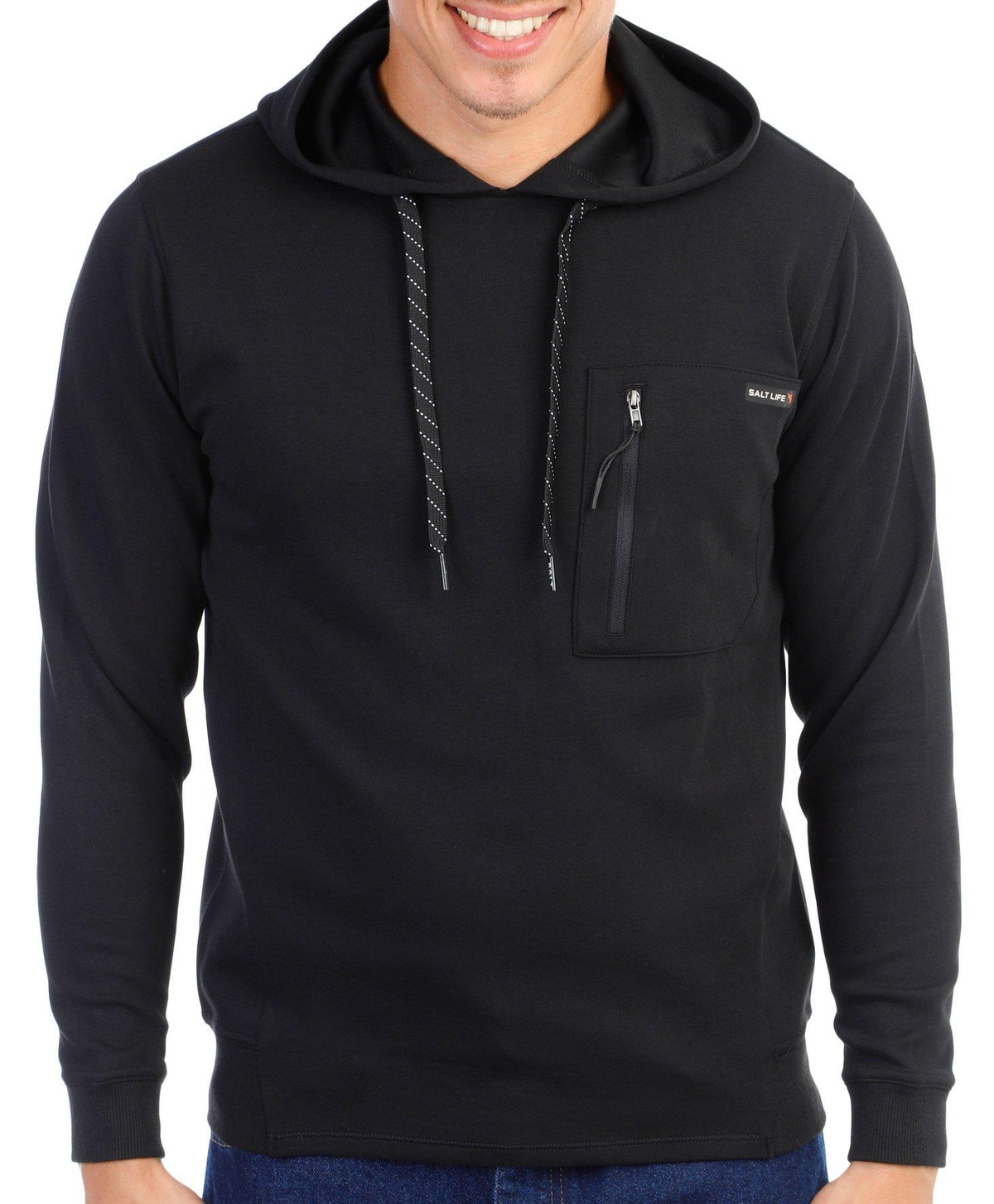 The Gaffer lightweight performance fleece pullover hoodie is a must-have this season! Made from a lightweight double-face performance fleece for a soft to the touch feel and comfortable fit, this Salty Life pullover hoodie is perfect for casual wear and layering during transitioning weather. It features a drawstring hood, zipped utility pocket, and moisture-wicking fabric. Fabrication is 56% cotton, 41% polyester, and 3% spandex.