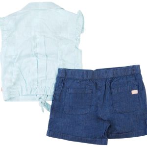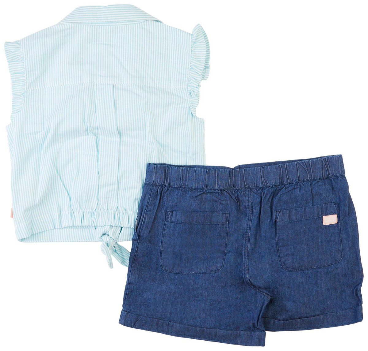 The Little Girls 2 Piece Shorts Set features a sleeveless button down striped shirt with sweet ruffle trim paired with dark denim wash chambray shorts. This charming outfit blends classic style with playful details for a fresh warm weather look. Fabrication 100% cotton