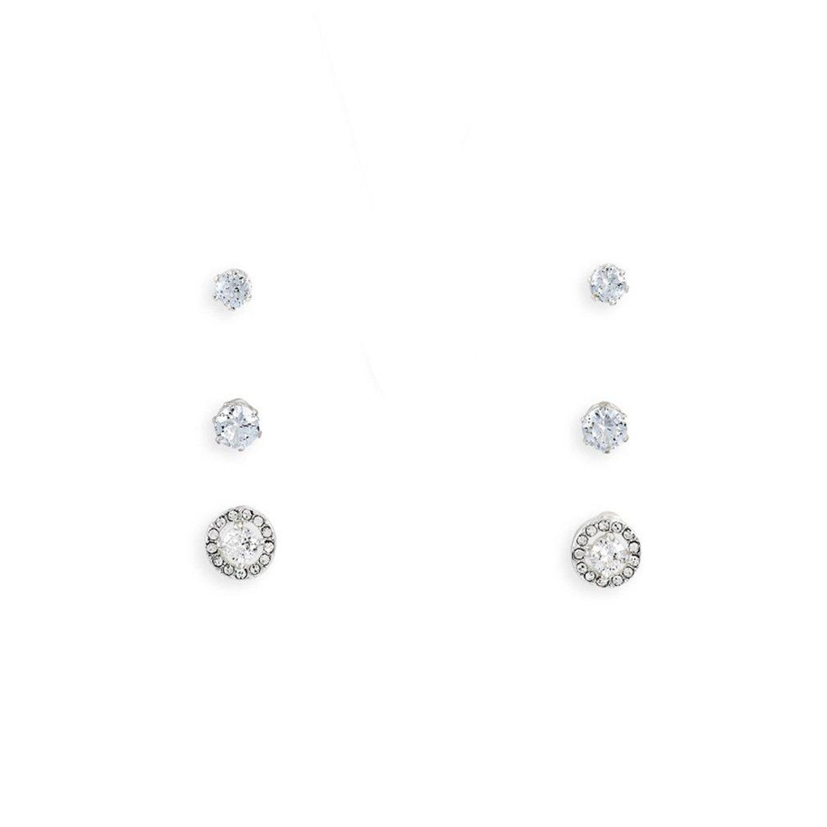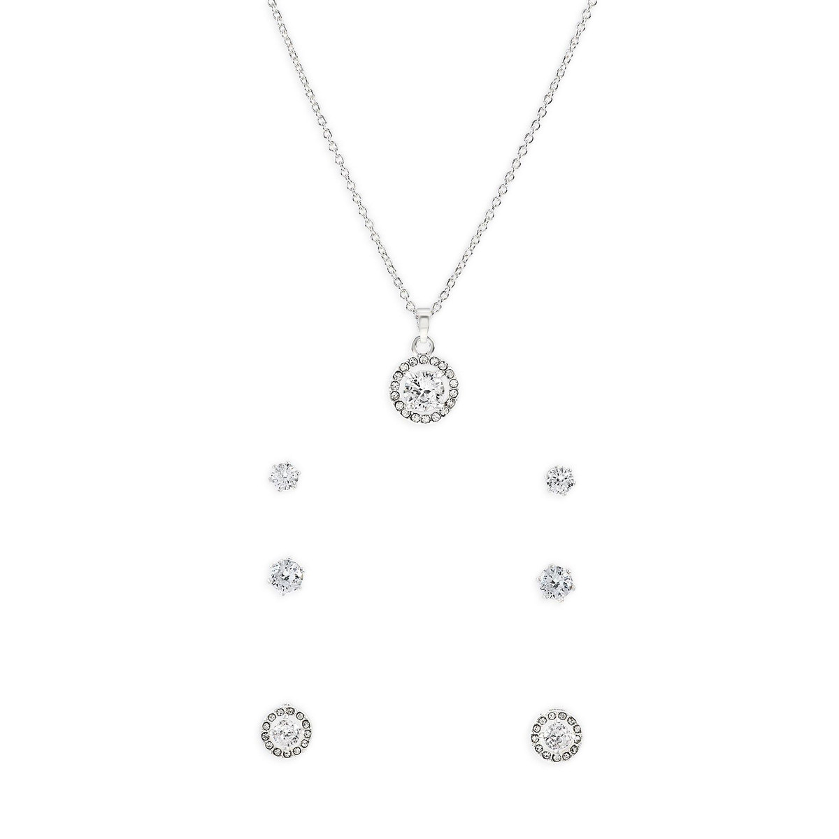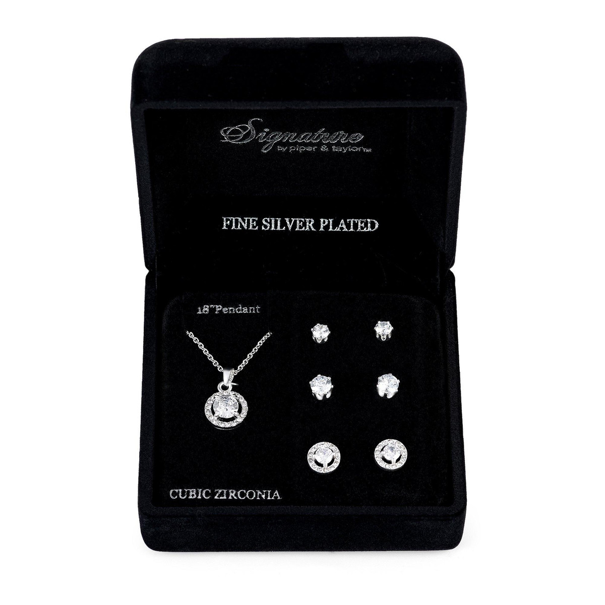 The Signature CZ Halo Necklace & 3-Pc. Stud Earrings Set features a dazzling halo-style pendant necklace, surrounded by sparkling cubic zirconia stones for added brilliance. The set includes three pairs of stud earrings, each offering a different style: classic CZ studs, chic pearl studs, and a statement design, all designed to complement the necklace. Perfect for any occasion, this versatile set adds sophistication and shine to your jewelry collection.