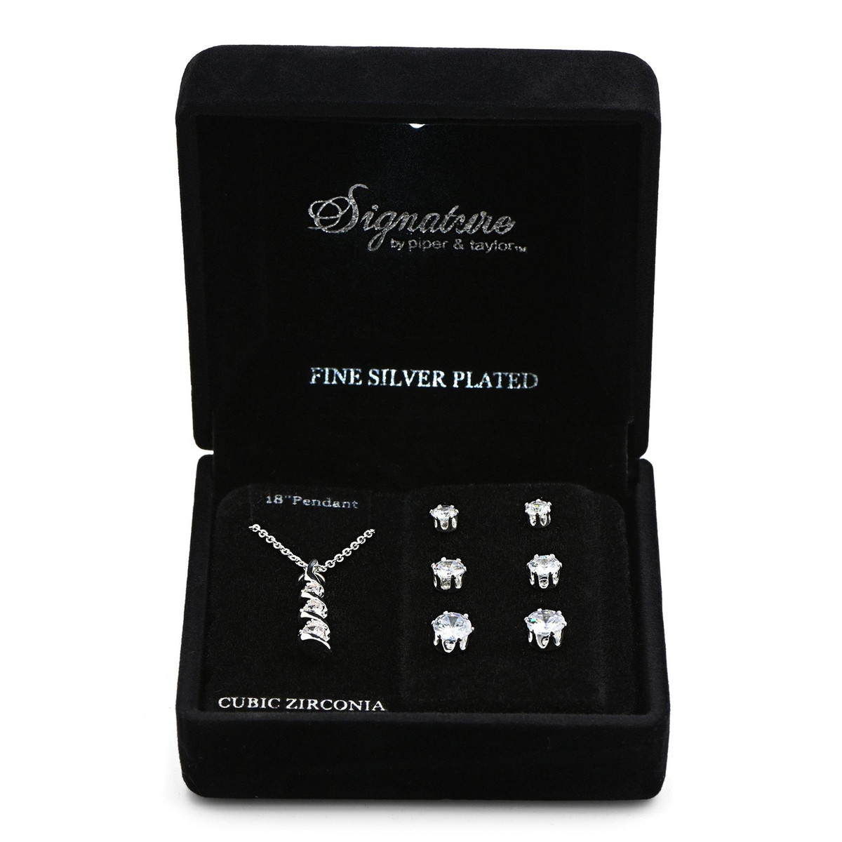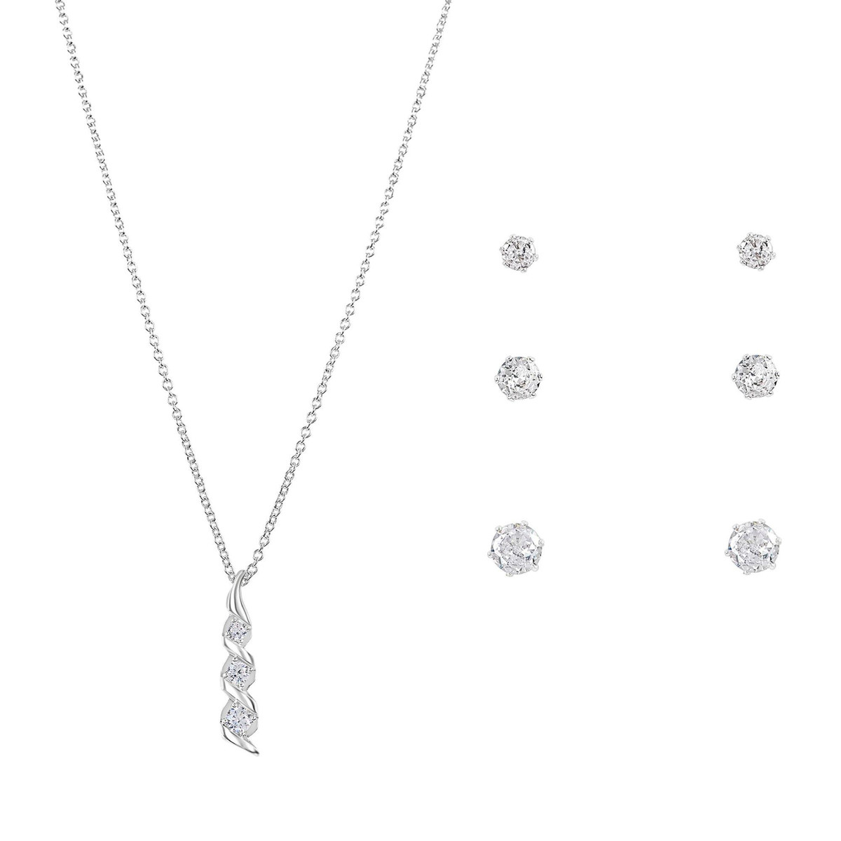 Signature CZ Ribbon Necklace & 3-Pk. Earrings Set