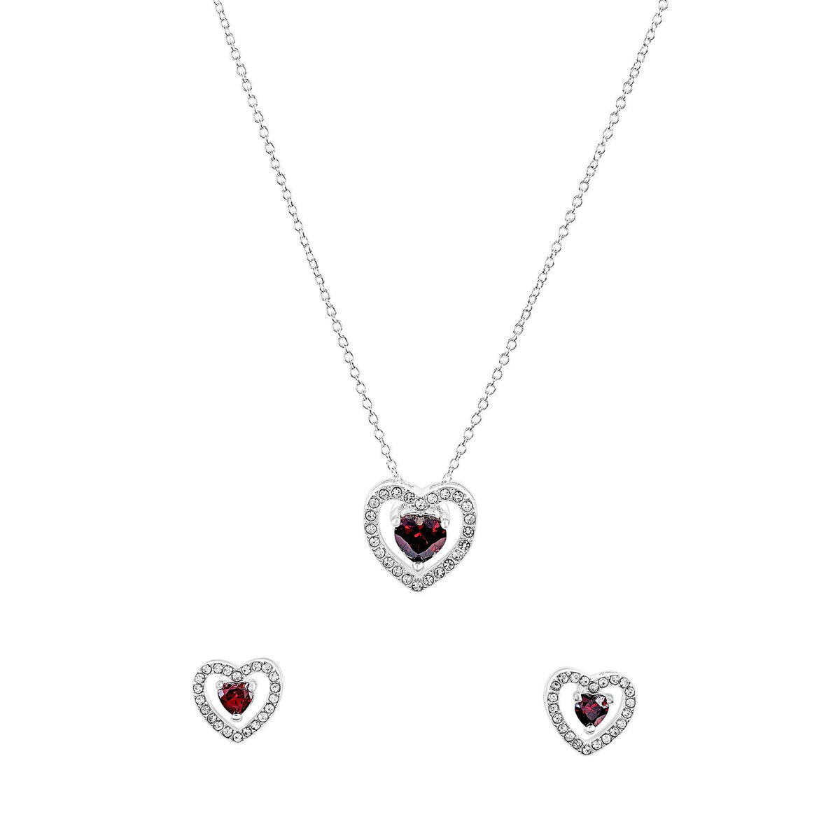 The Signature Red Halo Heart Necklace & Earrings Set features a stunning red heart-shaped pendant, surrounded by a halo of sparkling cubic zirconia stones, adding a romantic and elegant touch. The matching earrings mirror the heart design, providing a coordinated and sophisticated look. Perfect for special occasions or as a thoughtful gift, this set adds a vibrant pop of color and timeless beauty to any outfit.