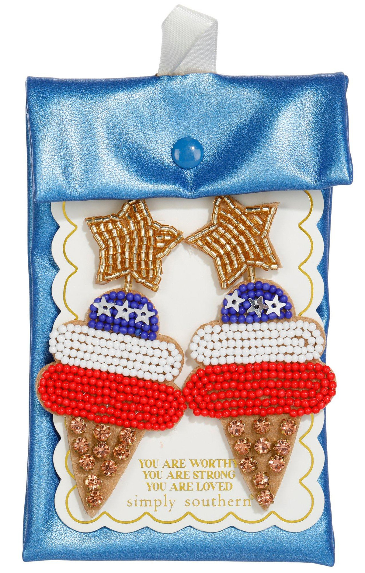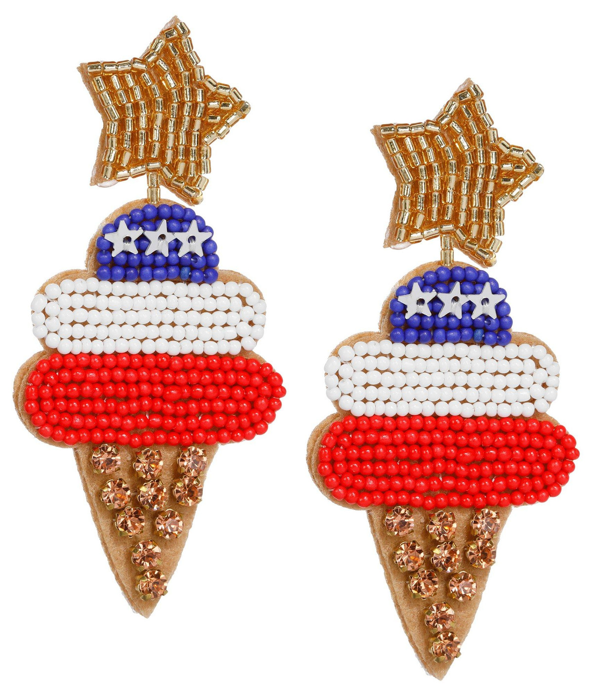 Make a statement with a pair of these patriotic beaded earrings. Made with glass, alloy , and plastic. Each pair comes with a dustbag.