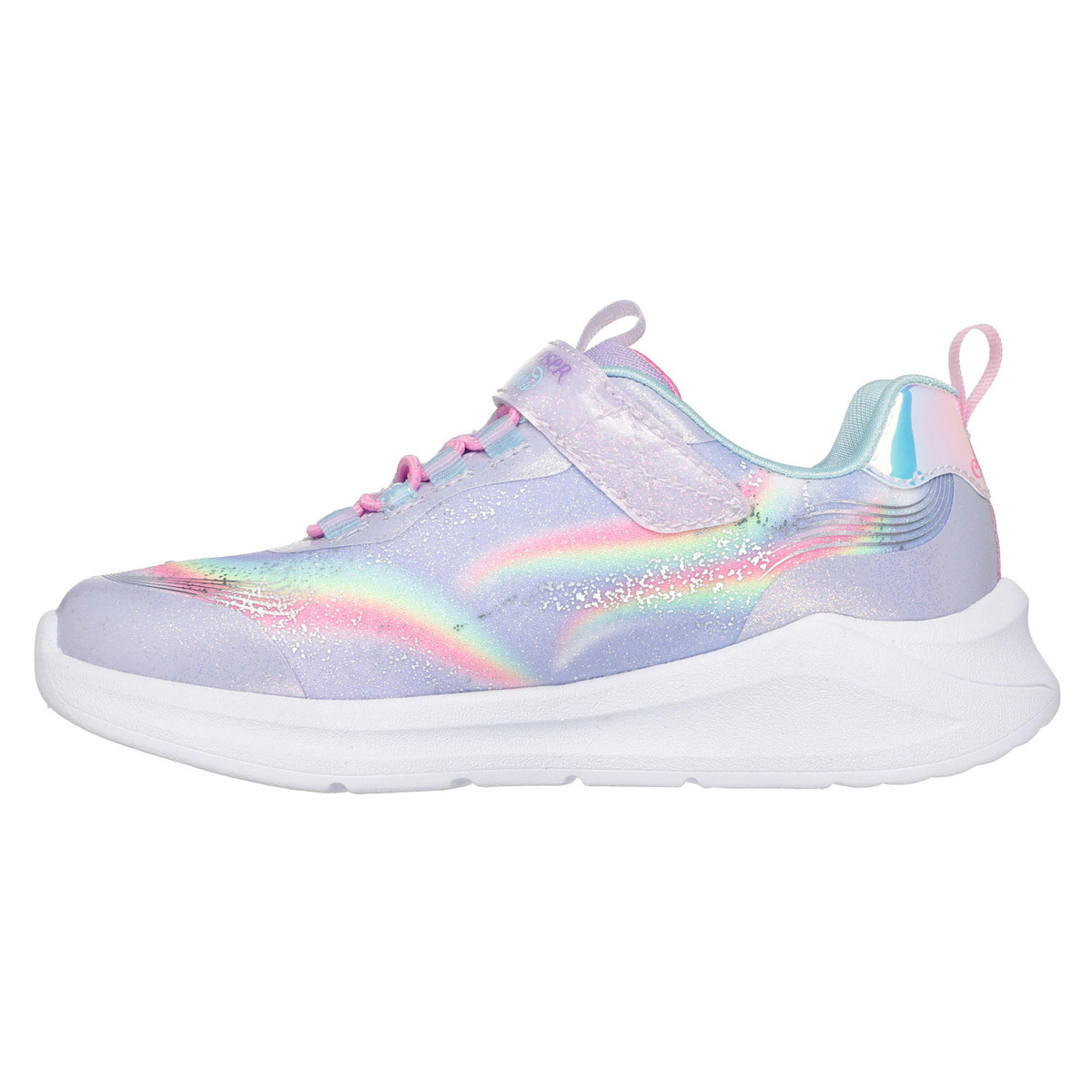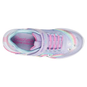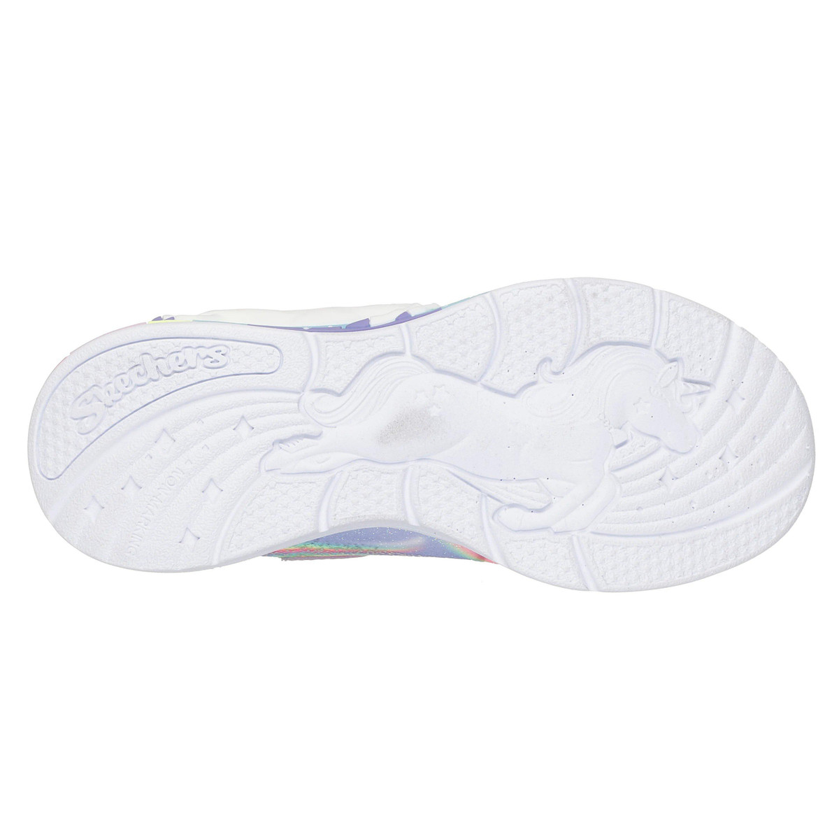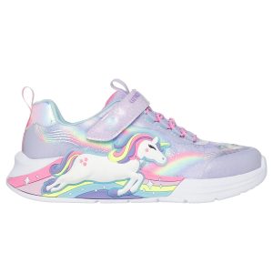Sparkle and shine in style wearing Skechers S-Lights® Unicorn Chaser. This sporty Magical Collection® lighted design features a synthetic glitter finish upper with unicorn and rainbow side graphic, stretch laces, adjustable instep strap, and a cushioned comfort footbed. Features on/off button and easy on/off adaptive closure for a customized fit.