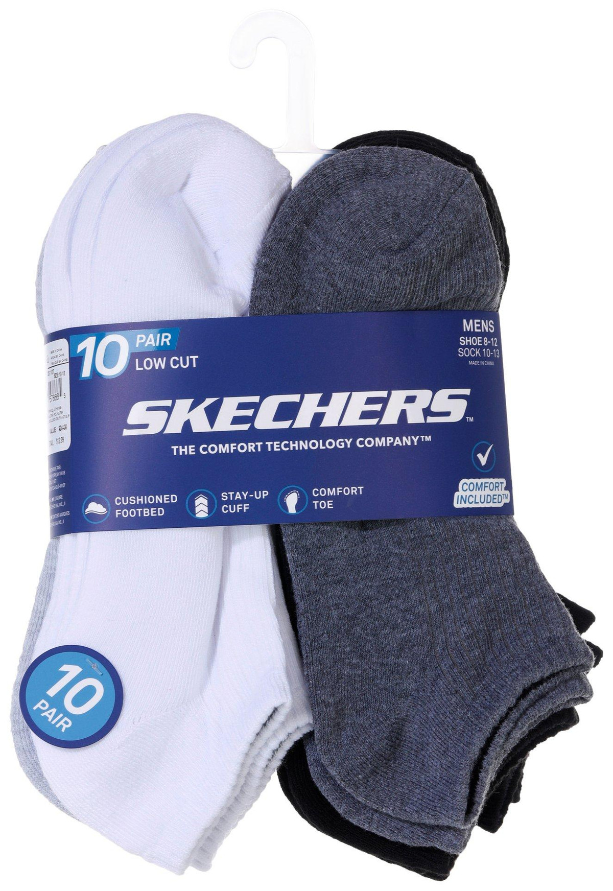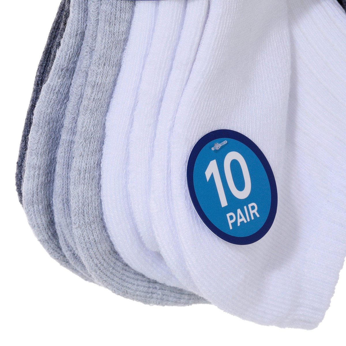 Stay comfortable all day with this 10-pack of low-cut socks, featuring a cushioned footbed, stay-up cuff, and comfort toe. Designed for a no-show look with a supportive fit, they’re perfect for both everyday wear and athletic use. Sock sizes: 10-13. Material: 98% Polyester, 2% Spandex