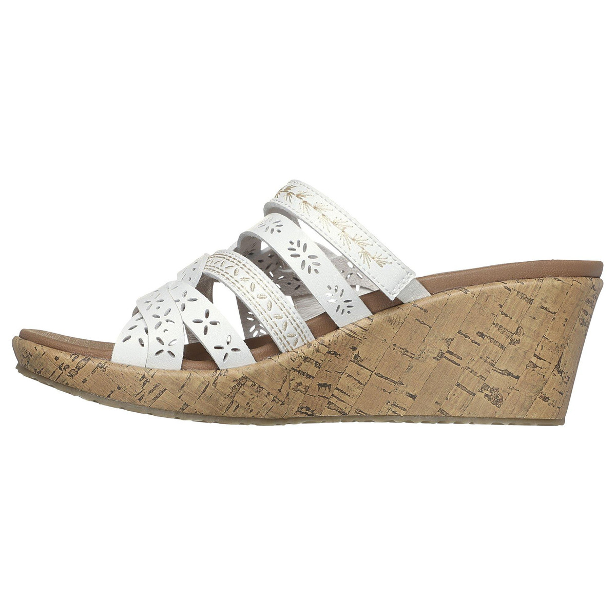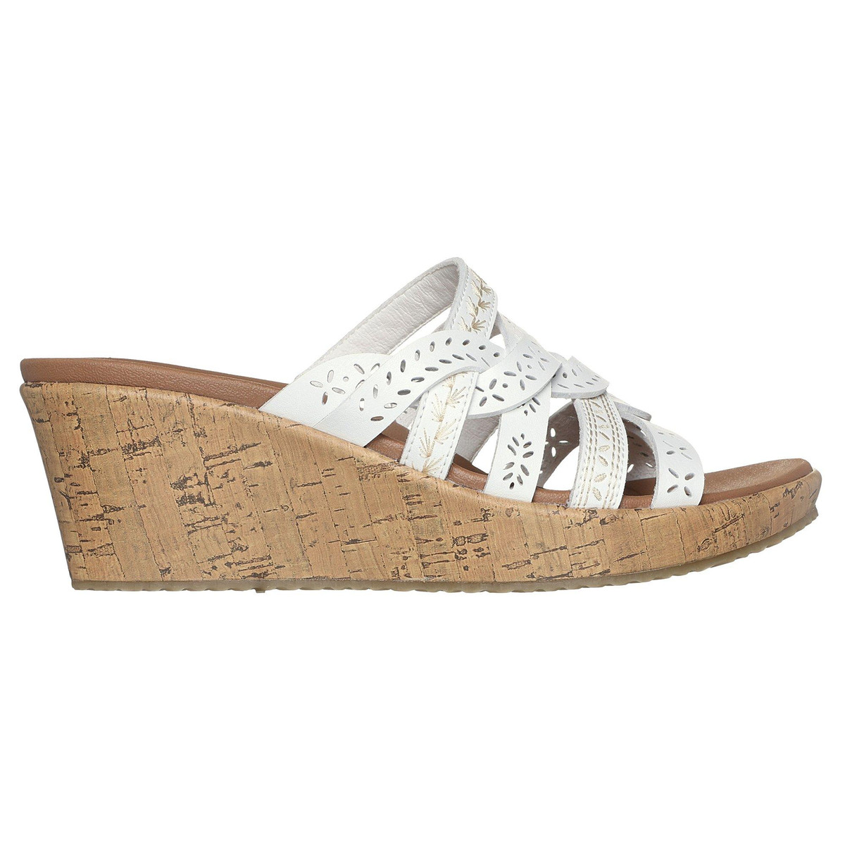 Summery style and absolute comfort combine in Skechers Beverlee Resort wedge sandals. This strappy vegan wedge sandal features an embroidered and laser-cut synthetic upper with an adjustable back strap and a cushioned Luxe Foam footbed.