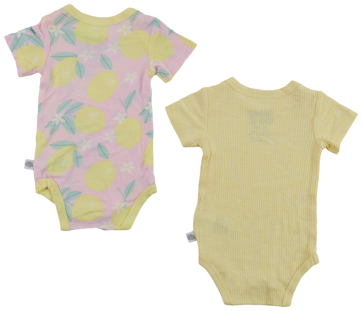 Brighten her essentials with the Baby Girl 2 Pk Bamboo Lemon Bodysuit Set. Made from ultra-soft bamboo fabric, this set includes two bodysuits featuring lemon-themed prints and soft pastel accents. Gentle on delicate skin with snap closures for easy changes. Ideal for warm-weather wear, layering or gifting. Machine wash cold for easy care.