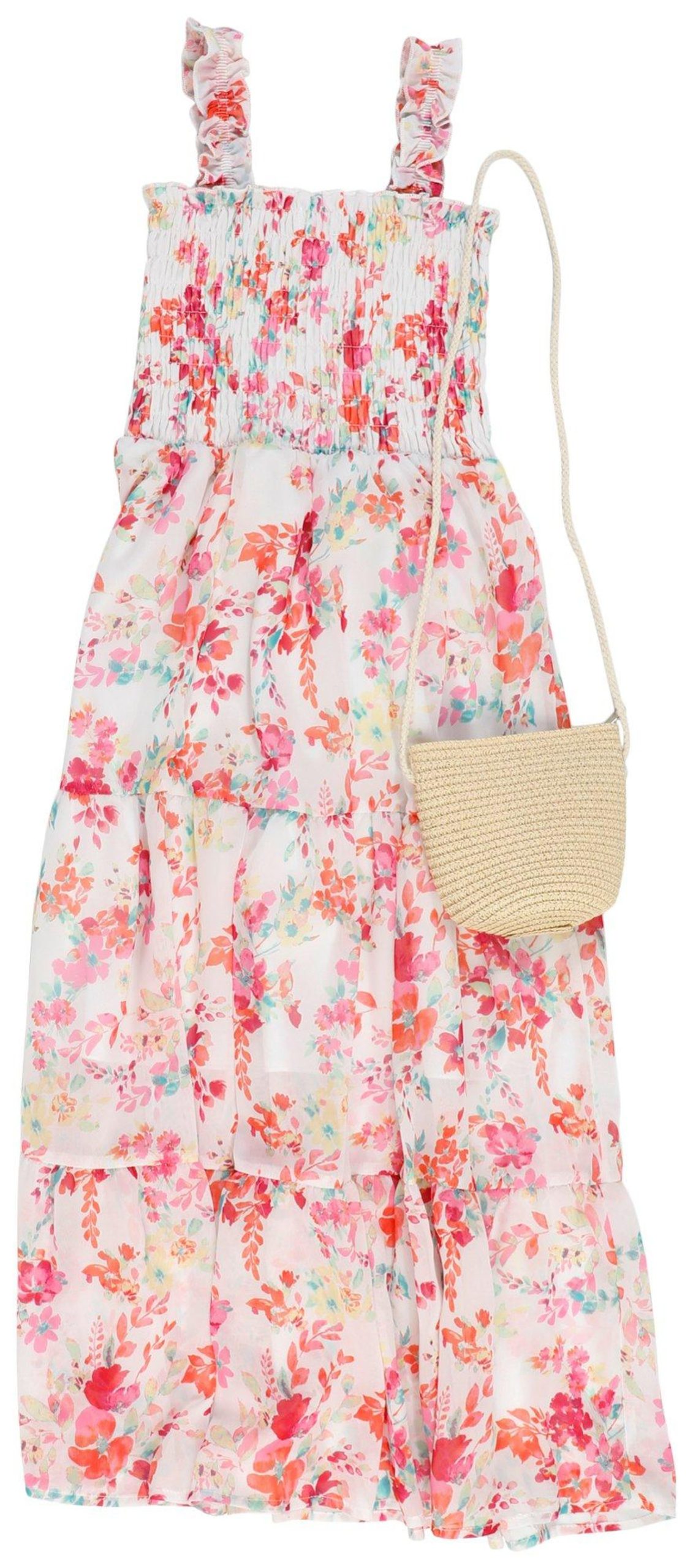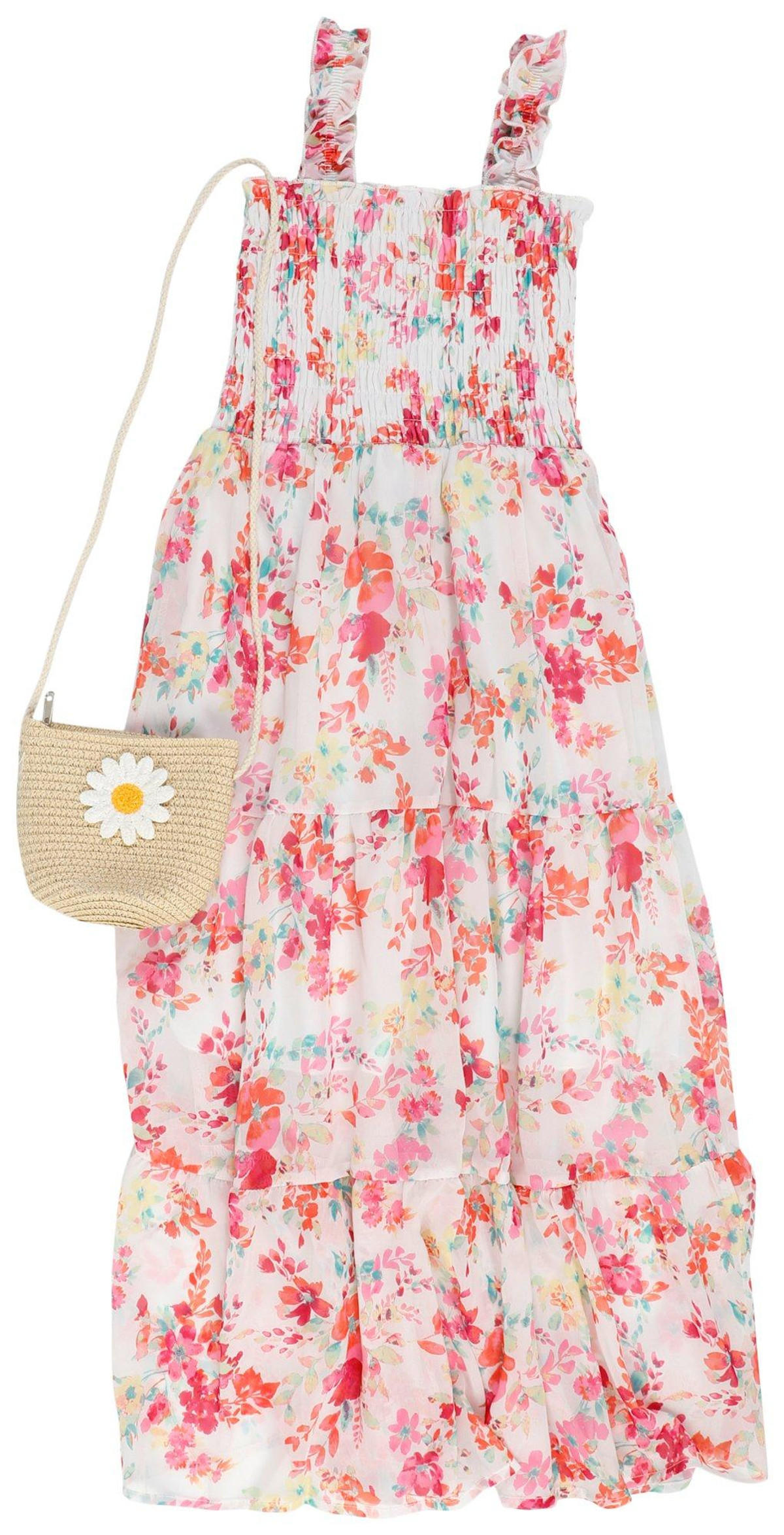 This lightweight and breezy chiffon dress is a must-have for warm-weather adventures! Designed for both comfort and style, it features a stretchy smocked bodice for the perfect fit and a flowy maxi-length silhouette thats effortlessly chic. Plus, it comes with a beautiful flower-embellished purse for a complete and charming look!