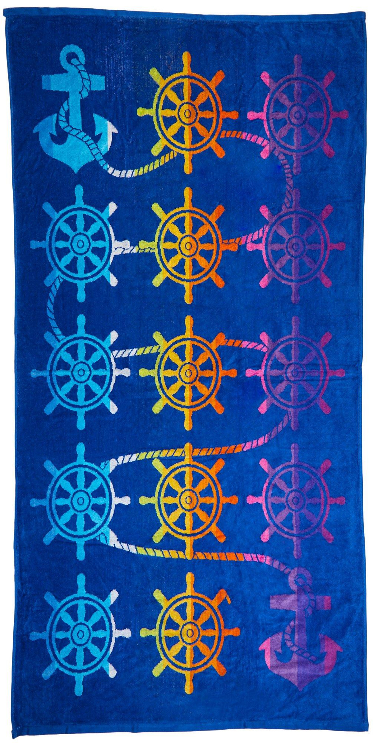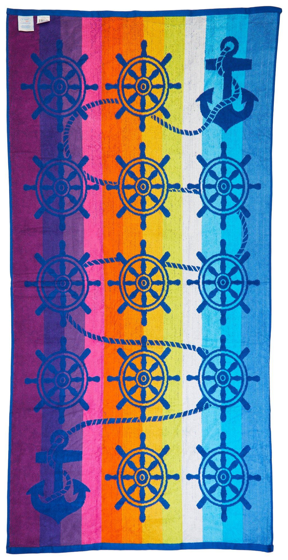 Nautical vibes meet plush luxury with this jacquard velour beach towel, featuring a pattern of ships helms and anchors and ropes, that brings a nautical vibe to your seaside or poolside lounging. Soft, absorbent, and richly textured, its a vibrant essential for sunny days and sandy escapes. Fabrication is 100% cotton. Measures 36 in x 70 in.