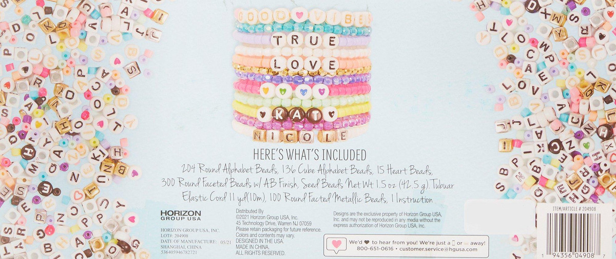 Keep her fashionable with this friendship bracelet set by STMT. Includes 204 round alphabet beads, 136 cube alphabet beats, 15 heart beads, 300 round faceted beards w AB finish, seed beads, tubular elastic cords, 100 round faceted metallic beads and instructions.