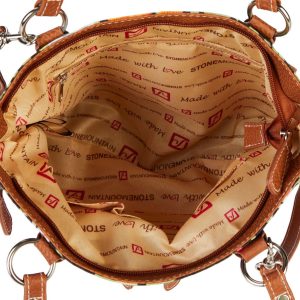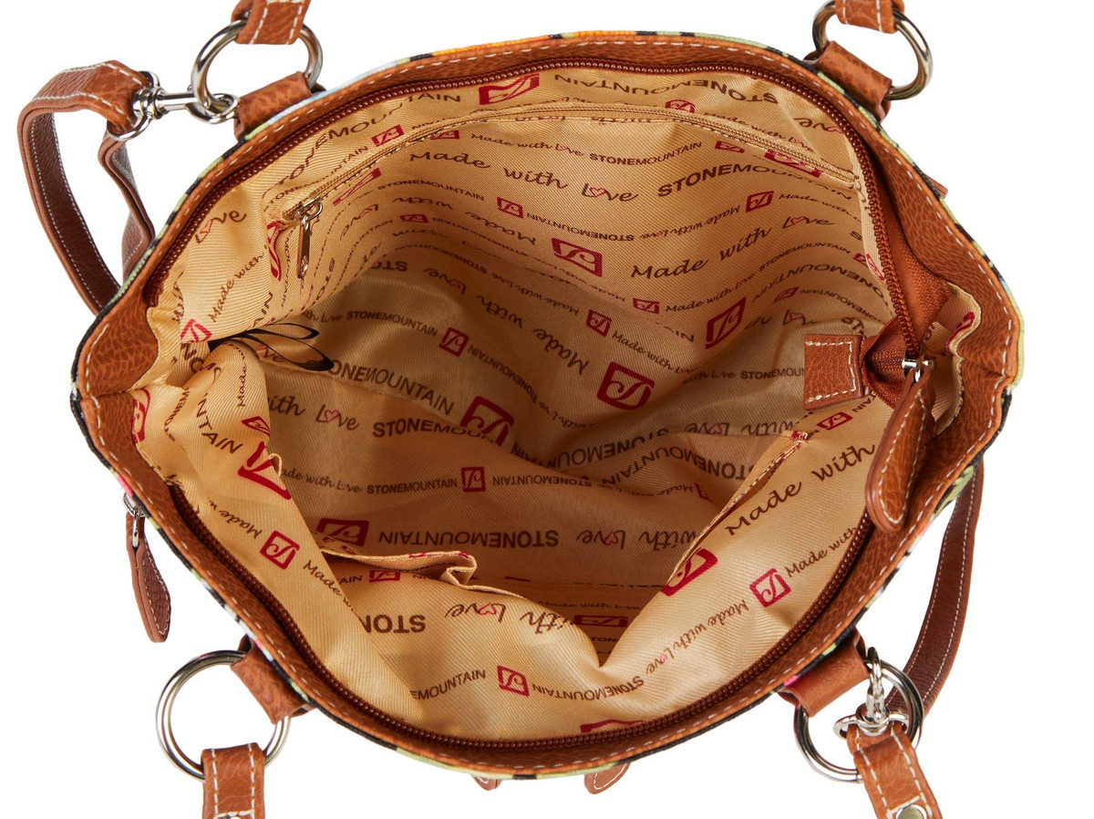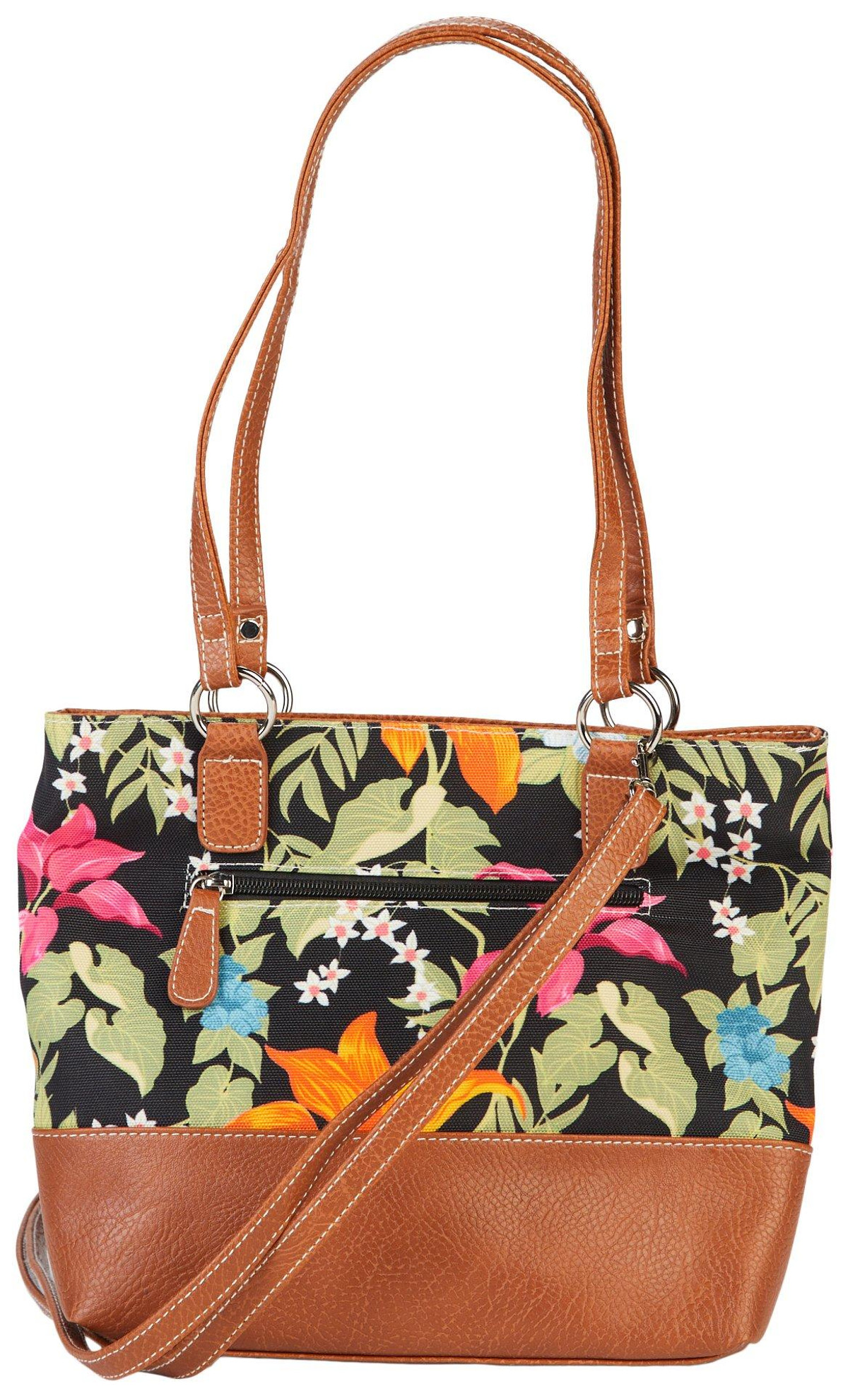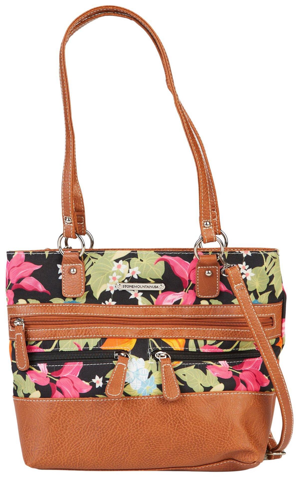 Have all the space you need with this Stone Mountain tropical garden canvas shoulder bag. Providing top zip closure, double satchel handles, an adjustable crossbody strap, exterior zip pockets for added space, interior slip pockets, and a bold and bright floral design throughout. Measures: 9 on. H x 13 in. W x 3 in. D. Handle Drop: 26 in.