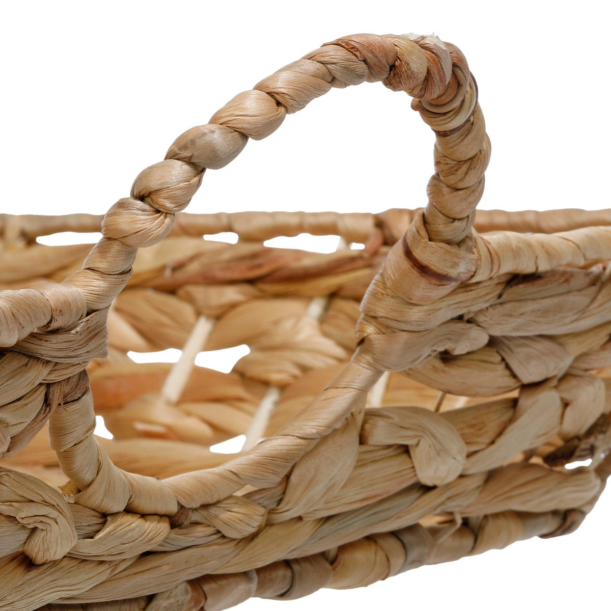 This large weaved storage tray offers a stylish and functional way to organize and display essentials. With its natural texture and sturdy design, this tray is perfect for serving, storing or decorating. Measures approximately 15 in x 21 in x 3 in, including handles.