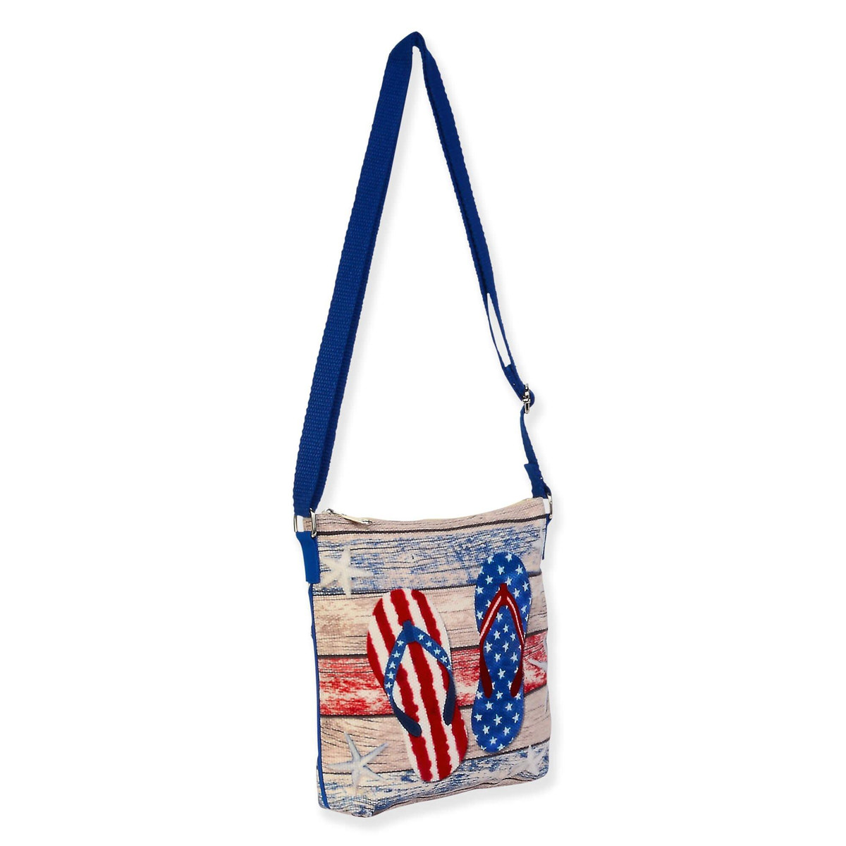 Introducing the Americana Flip Flop Crossbody Beach Tote Bag, crafted from sturdy canvas material and featuring a vibrant print. This stylish tote includes top handles, a top zip compartment with inner slip and zip pockets, side slip pockets, and a detachable zip pouch. It’s perfect for carrying all your beach essentials in style.