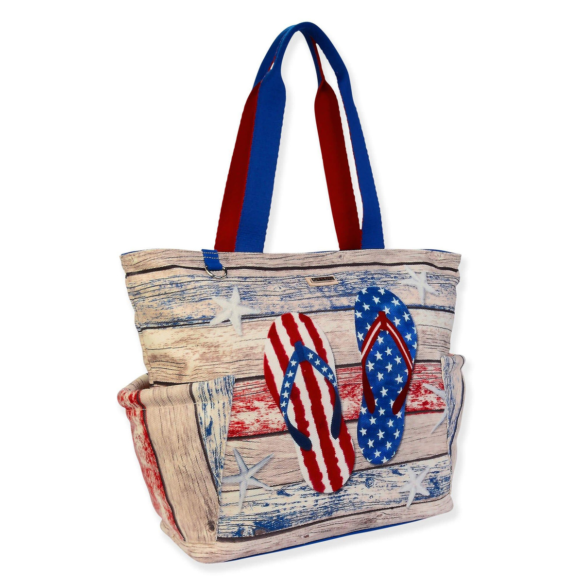Introducing the Americana Oversized Flip Flop Crossbody Beach Tote Bag, crafted from sturdy canvas material and featuring a vibrant print. This stylish tote includes top handles, a top zip compartment with inner slip and zip pockets, side slip pockets, and a detachable zip pouch. It’s perfect for carrying all your beach essentials in style.