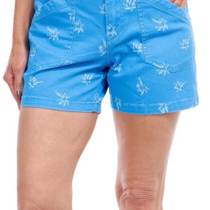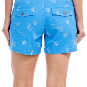 Stay cool and stylish with the Alix Palm Print Twill Shorts. Featuring a vibrant palm print, these shorts are perfect for any casual outing. They come with double front and back pockets, providing ample storage for your essentials. Made from comfortable twill fabric, these shorts offer both durability and a relaxed fit. Inseam measures approximately 5 in. Fabrication is 96% cotton, 4% spandex.