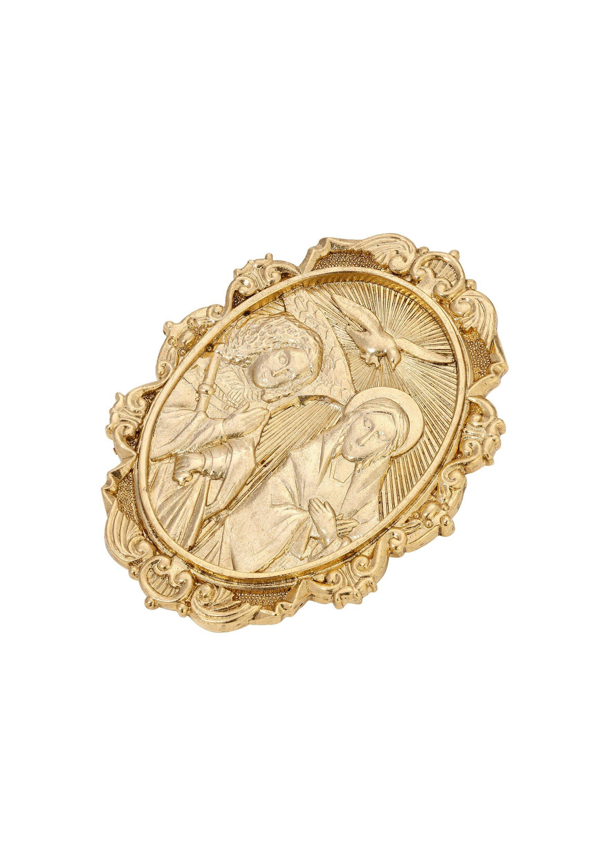 Honor your faith with the Symbols of Faith Father, Son & Holy Spirit Oval Pin. Crafted in radiant gold-tone, this inspirational pin showcases the Holy Trinity in a timeless design. Perfect for spiritual expression, religious gifting, or personal wear. Features a secure pin closure for lasting comfort and style. Length 2.15 in., width 38mm.