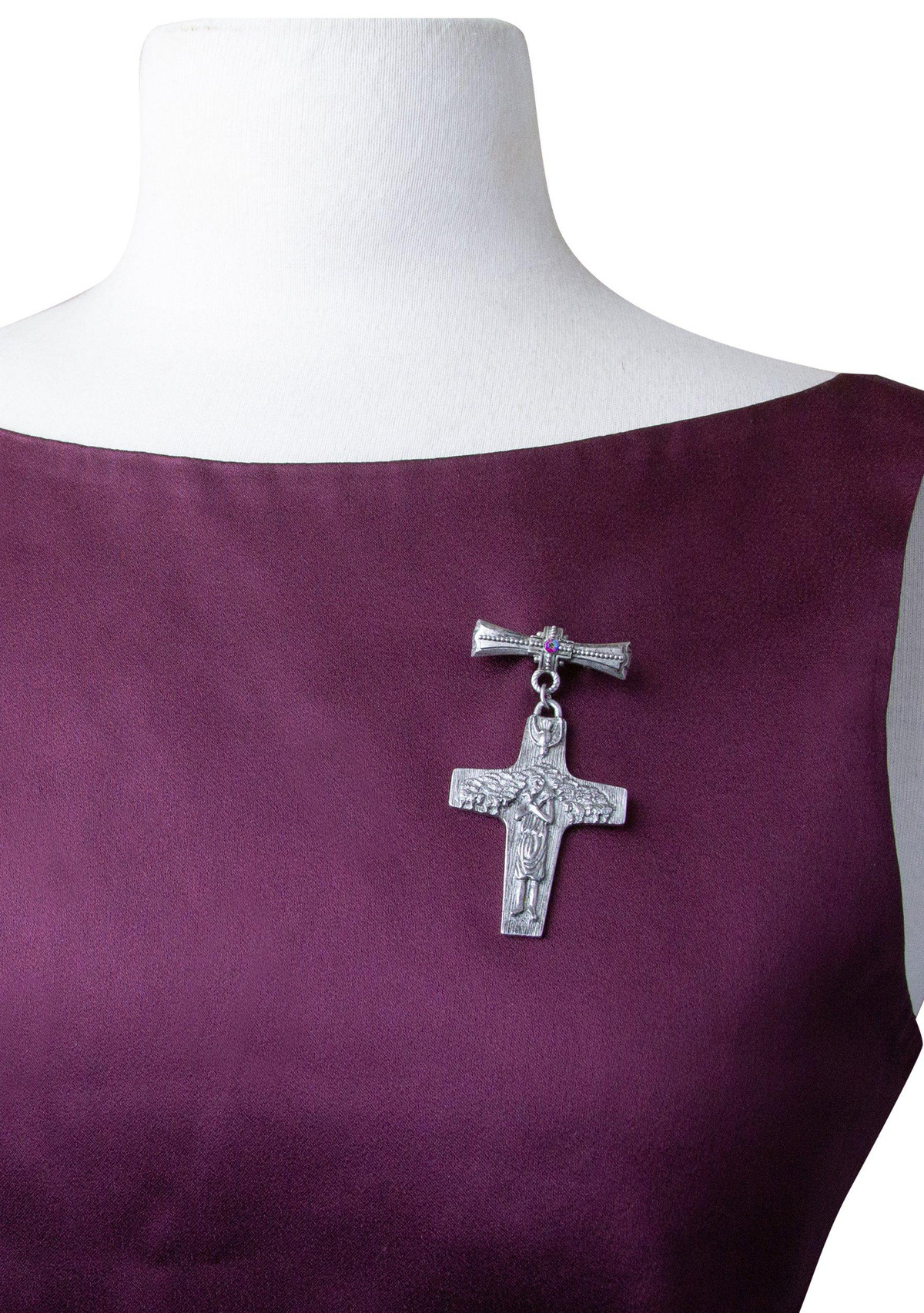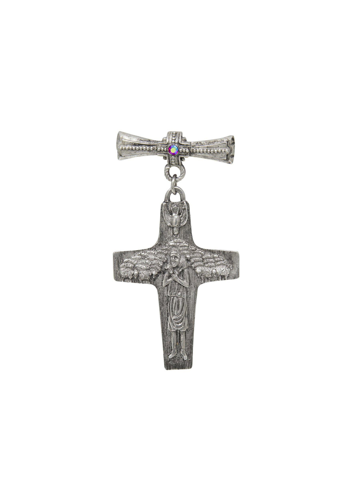 Honor your faith with the Symbols of Faith Red Stone Pope Francis Cross Pin. A replica of the pastoral crucifix worn by Pope Francis, it features the Good Shepherd with His flock and a shimmering AB crystal accent. This gold-tone pin is a powerful symbol of compassion and devotion. Perfect for personal inspiration, religious gifting, or special occasions. Secure pin closure included. Length 2.6 in., width 35mm.