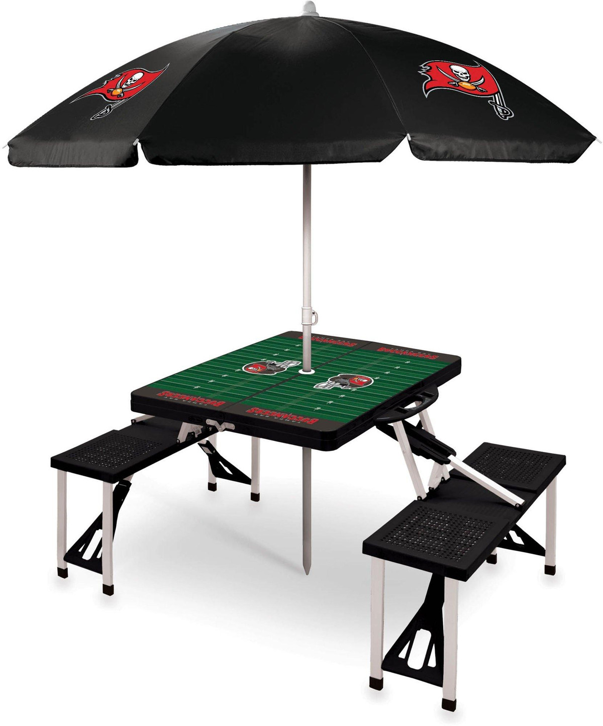 Picnic Time’s portable Picnic Table has legs and seats that fold into the table when collapsed and has a maximum weight capacity of 250 lbs. per seat and 20 lbs. for the table. Includes a standard sized beach umbrella. Measures 34” x 4.25” x 66” and weighs 20lbs.