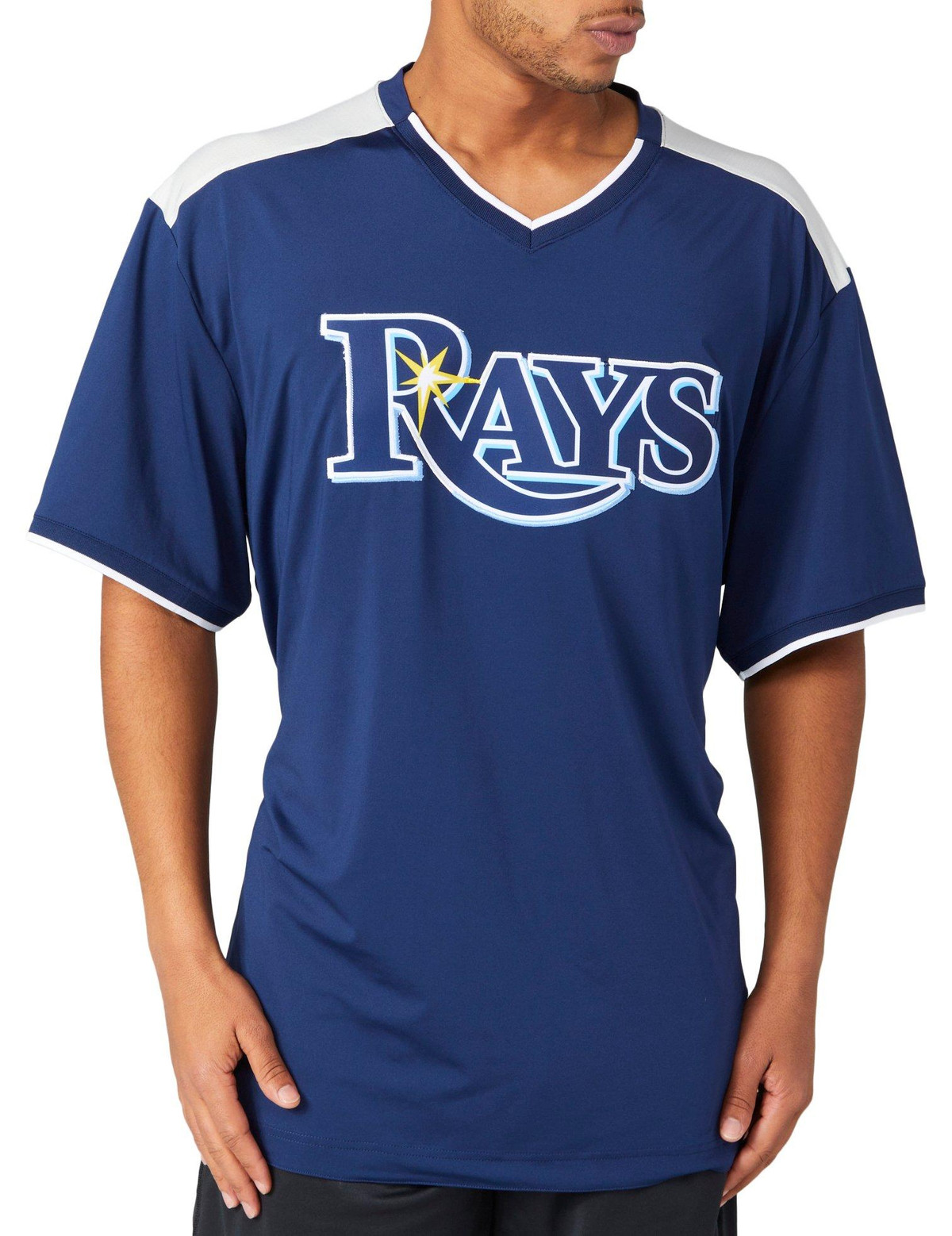 Show your Tampa Bay Rays pride in this jersey-style short-sleeve top! It features a v-neckline, short sleeves, and a front Rays screen-print logo.