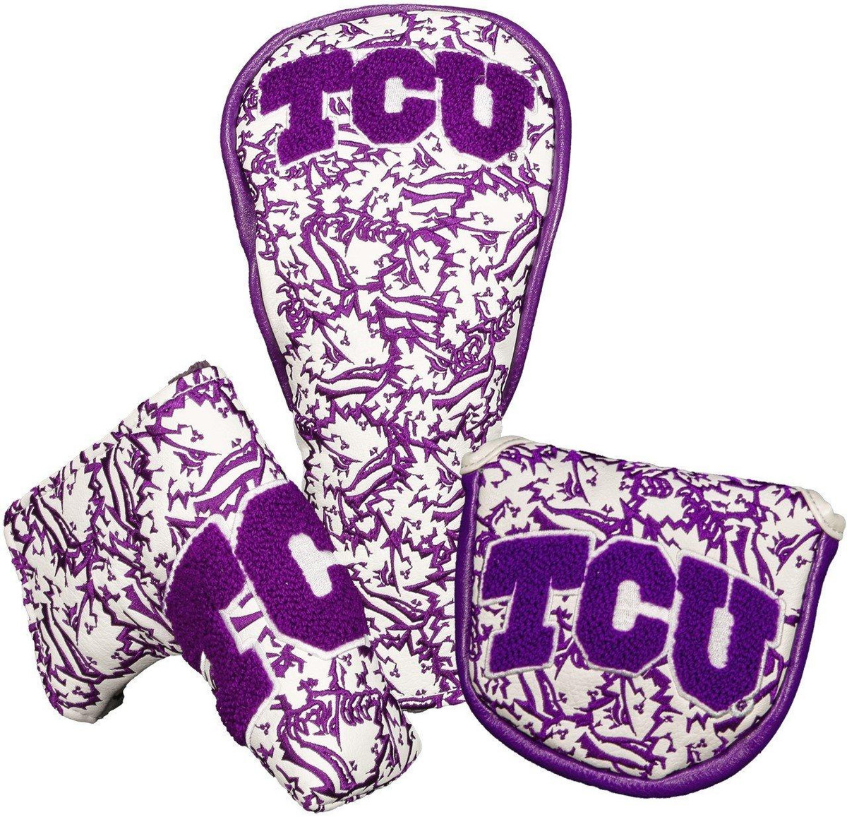 Rep your team with a custom TCU Texas Christian University Headcover from our highly sought-after NCAA Golf Collection. Our Golf Headcovers are uniquely designed in-house from CMC Designs. Add a touch of personality and enhance your golf game in style. Our headcovers are meticulously crafted using top-quality faux leather with a plush inner lining to protect your investment.