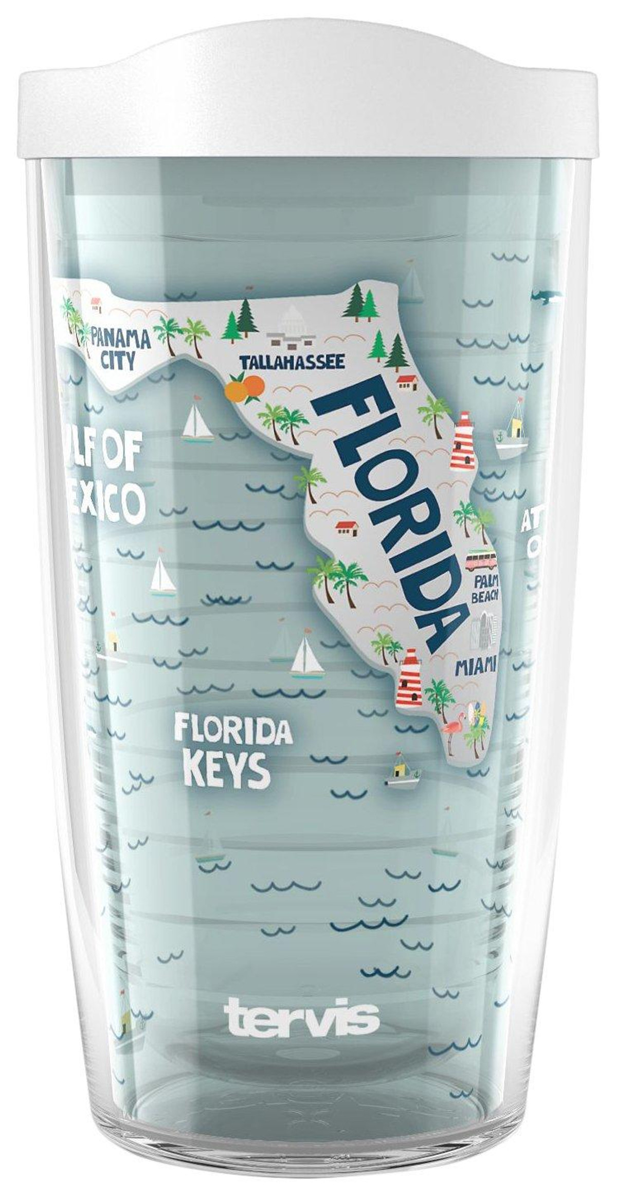Virtually unbreakable, Tervis Tumblers are the strongest drinkware available. The double wall insulation reduces condensation & keeps drinks hot or cold longer. This Florida map design is sealed between walls of tumbler. Lid included. Holds 16 oz.