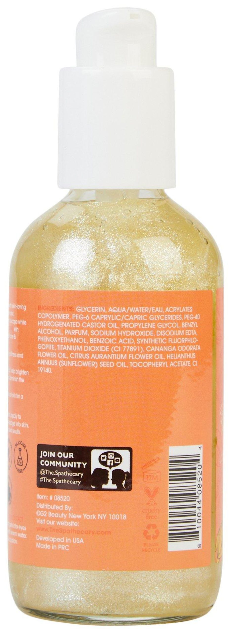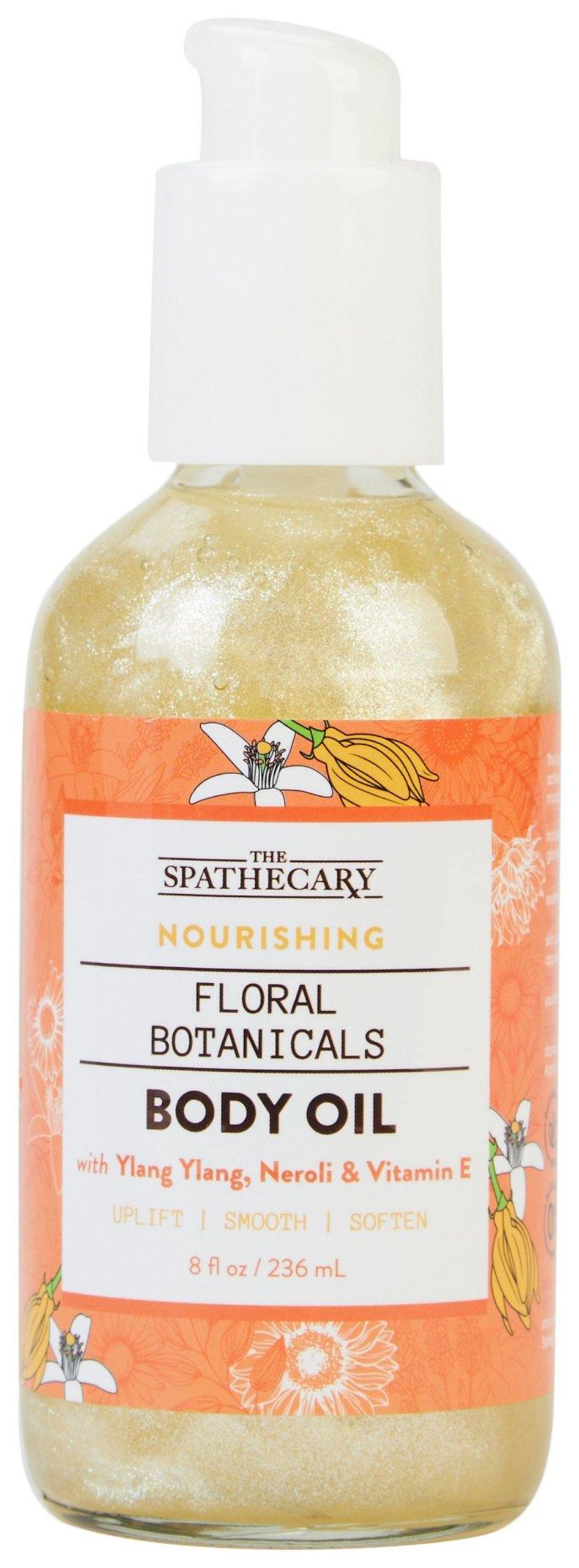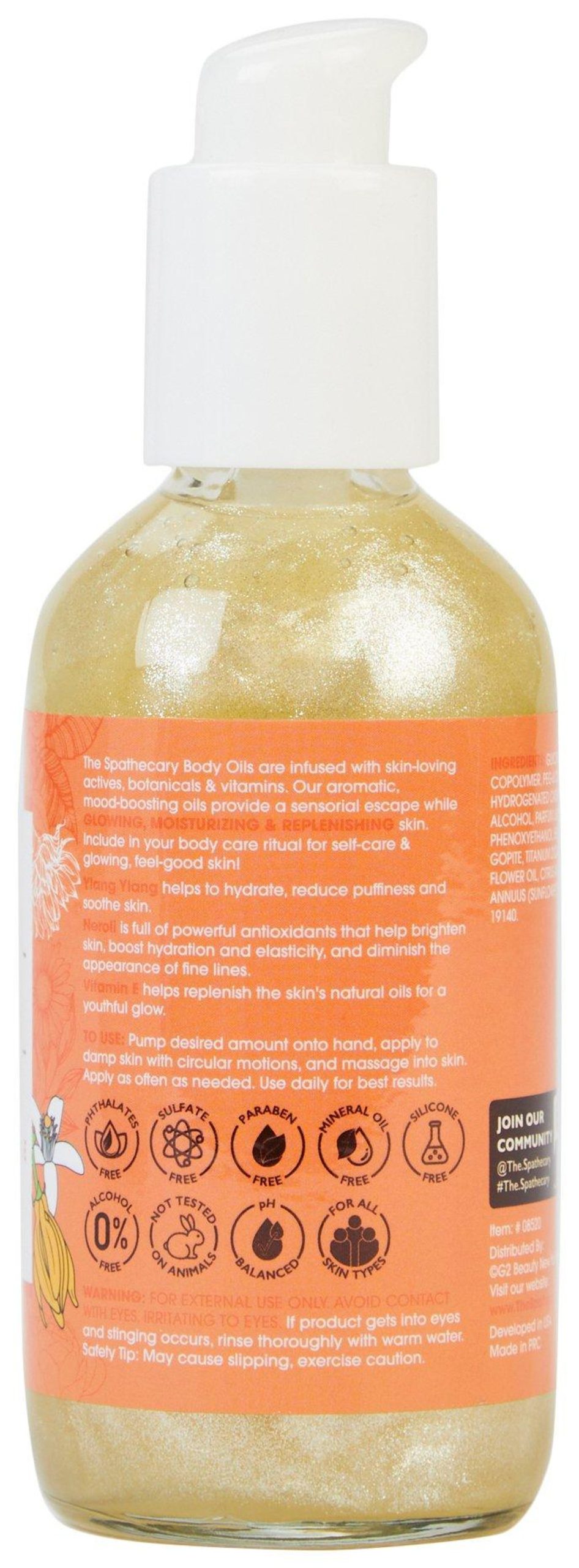 The Spathecary Body Oils are infused with skin-loving actives, botanicals & vitamins. Our aromatic, mood-boosting oils provide a sensorial escape while GLOWING, MOISTURIZING & REPLENISHING skin. Include in your body care ritual for self-care & glowing, feel-good skin! Pump desired amount onto hand, apply to damp skin with circular motions, and massage into skin. Apply as often as needed. Use daily for best results.