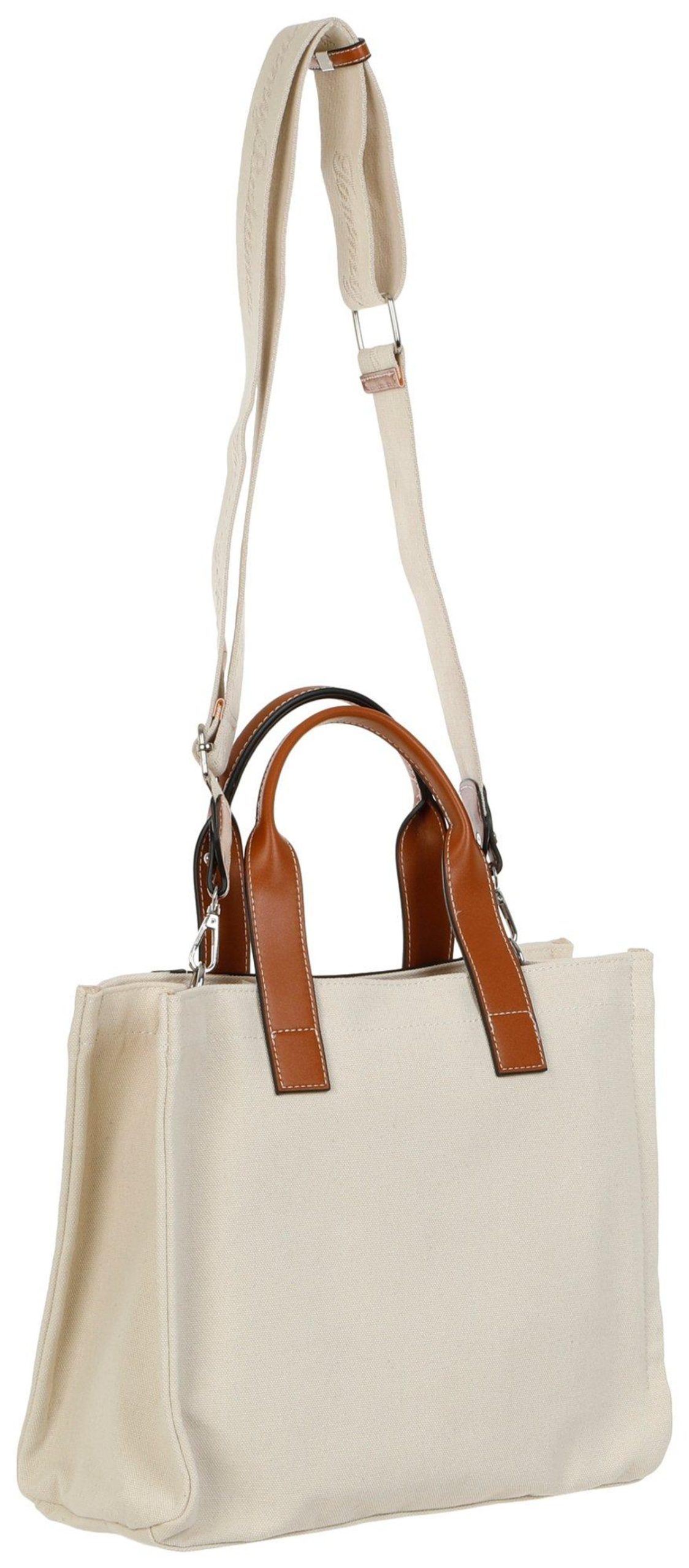 Introducing our Tommy Bahama Canvas Tote Bag, featuring a chic faux leather woven design on the front. It includes top handles, a crossbody strap, silver-tone hardware, and a top snap button compartment with an inner zip pocket. Measuring 12 in x 5 in x 12 in, this tote combines practicality with sophisticated style.