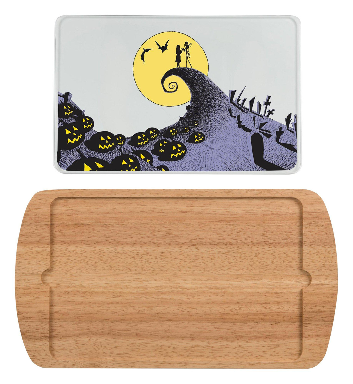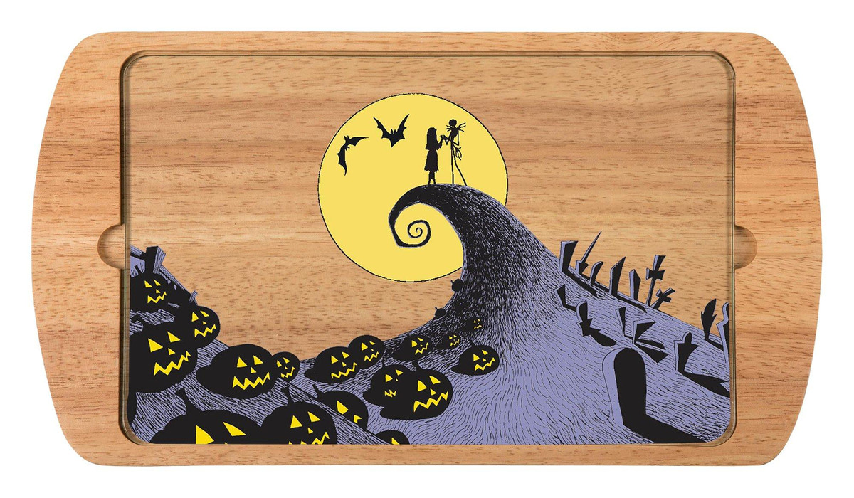Bright and refined, the Billboard Glass Top Serving Tray is a rubberwood cutting board with a removable and customizable glass plate top that features decoration of Disney Nightmare Before Christmas Jack & Sally . Glass is tempered and measures: 14 x 9.875 x .2 inches. Rubberwood base measures 17.5 x 9.75 x 7.55 inches.