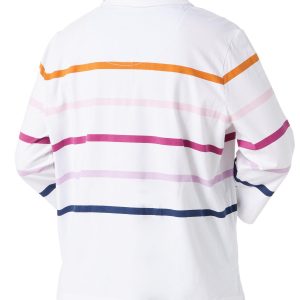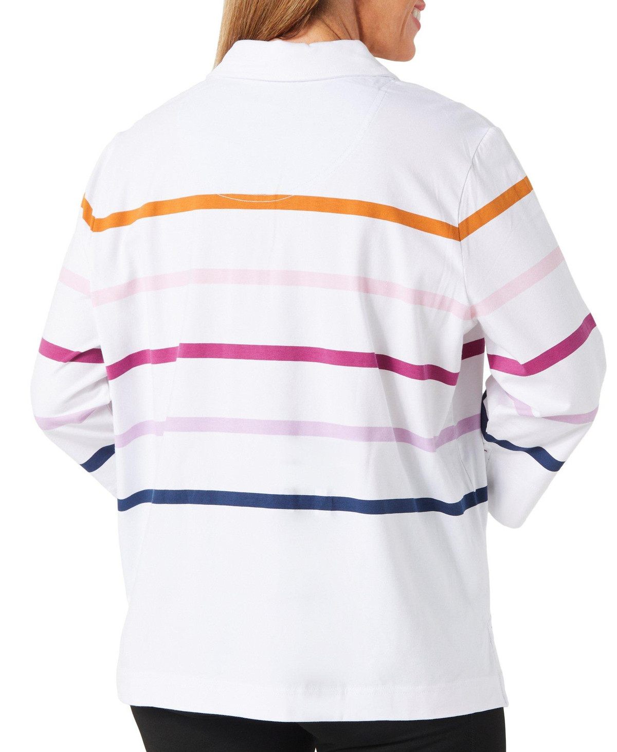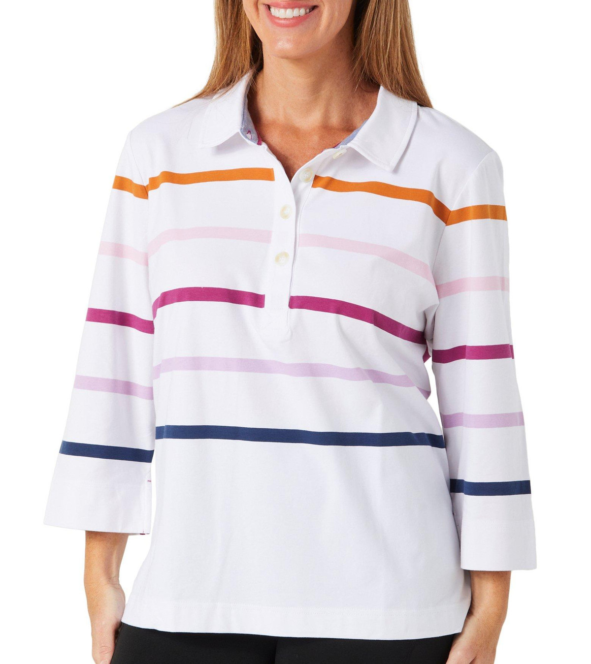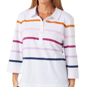 This womens three quarter sleeve stripe polo blends classic charm with modern comfort. Featuring a stylish striped print and a polo neckline it is perfect for casual days with its flattering three quarter length sleeves and easygoing fit.