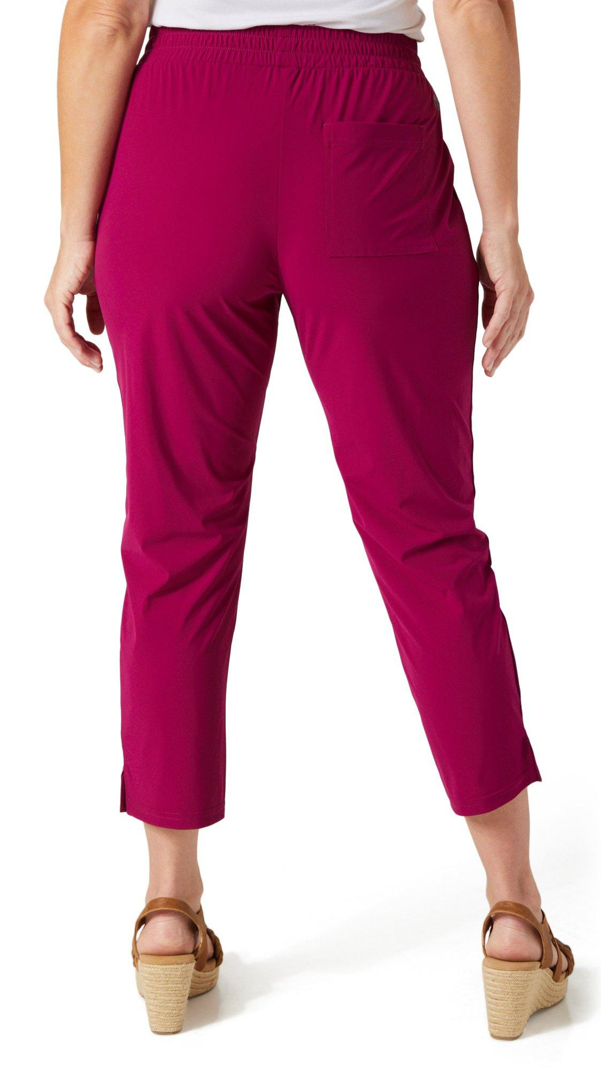 These womens active pull on tech pants offer sleek comfort with a solid color design and a 25 inch inseam. Featuring an elastic waistband and side seam pockets they are perfect for movement and everyday wear.