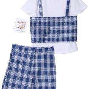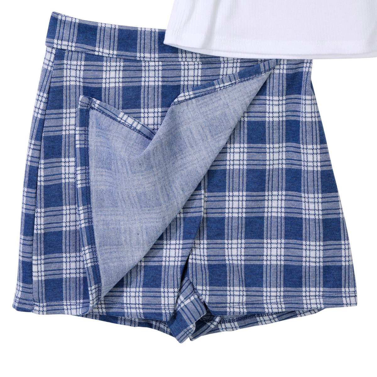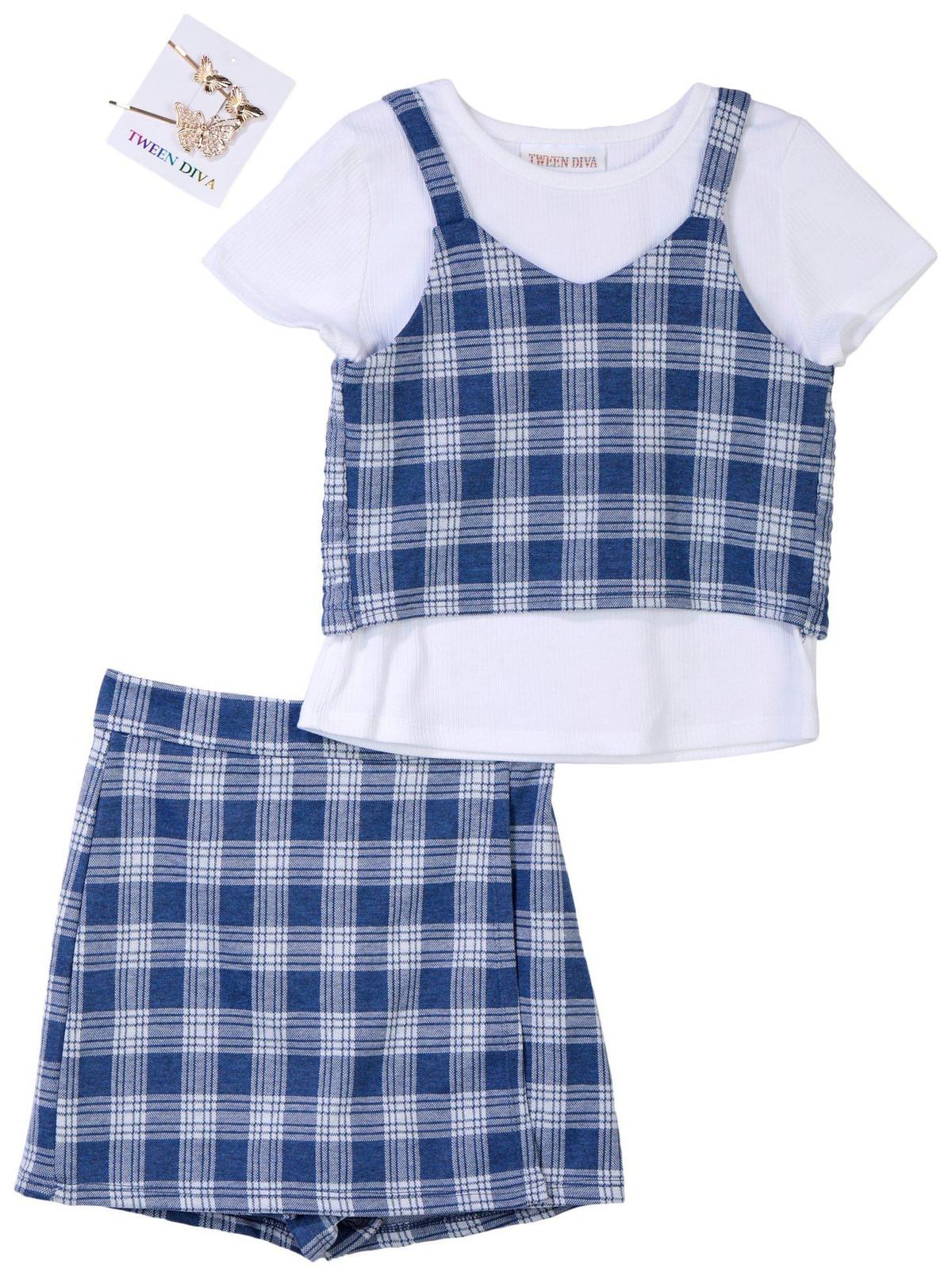 Delight her style with the Big Girls 2Pc Plaid Tee & Crossover Skort Set. Featuring a tee layered under a plaid vest and a matching crossover plaid skort, this set blends coordinated detailing and stretchy polyesterspandex fabric for flexible comfort. Ideal for school days, events or casual outings. Machine wash cold for easy care. Fabrication is 97% polyester, 3% spandex.