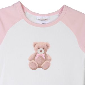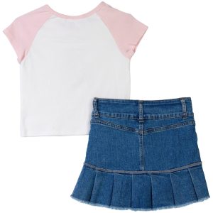 This two piece set for little girls includes a white crew neck tee with short pink sleeves and a cute teddy bear print. Paired with a denim skirt featuring built in biker style shorts for added comfort and coverage. Faux front pockets add a stylish touch to this playful and practical outfit.