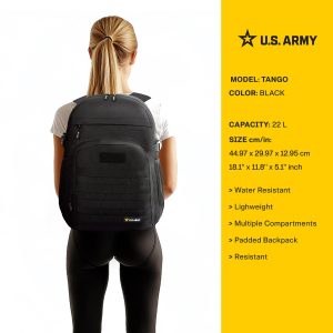 The U.S. Army TANGO Tactical Backpack has a lightweight, water-resistant has a 22-liter capacity, and features a well-organized multi-compartment layout to keep your essentials in order. It features MOLLE webbing and Velcro panel for patches on the front for added gear attachment, side compression straps, and a fully padded sleeve that fits laptops up to 15.6. Includes padded shoulder straps, a cushioned back panel, and adjustable sternum straps. Measures 18.1 x 11.8 x 5.1.