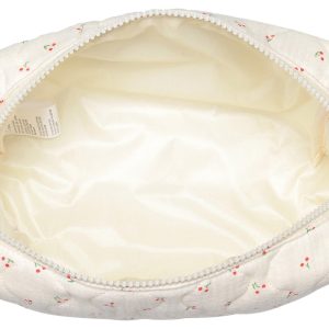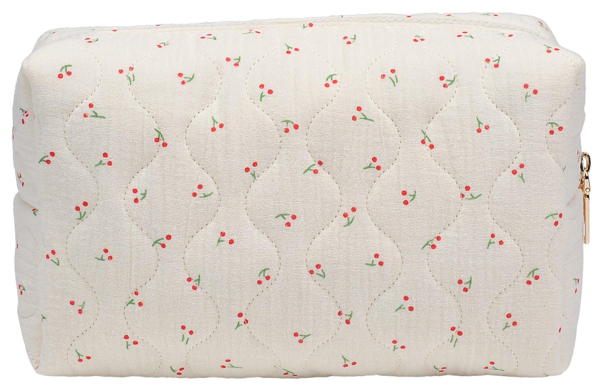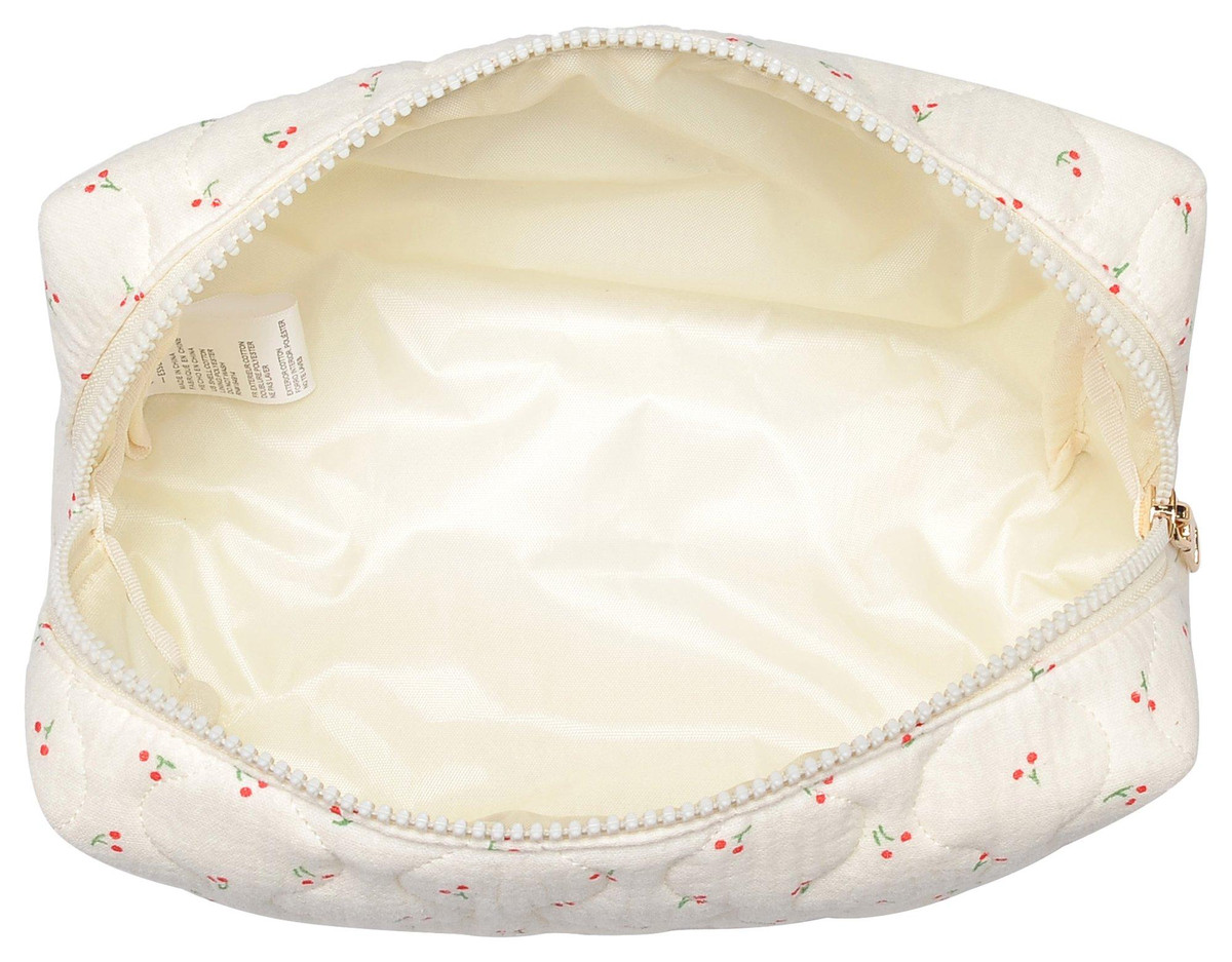Quilted printed cherry Patten , zipper pouch, great for cosmetics. Measures: 8.25 x x 3 x 5.13 Inches