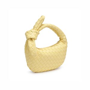 Introducing your new fave clutch, made from chic vegan leather. With a stylish zipper closure and an intricate woven design, this clutch boasts a unique knot handle detail and elegant gold hardware. Inside, the fabric lining keeps your essentials in check with a handy zip pocket. Perfect for adding a trendy touch to any outfit! Handbag measures 11.375 L x 2.125 W x 5.75 H.