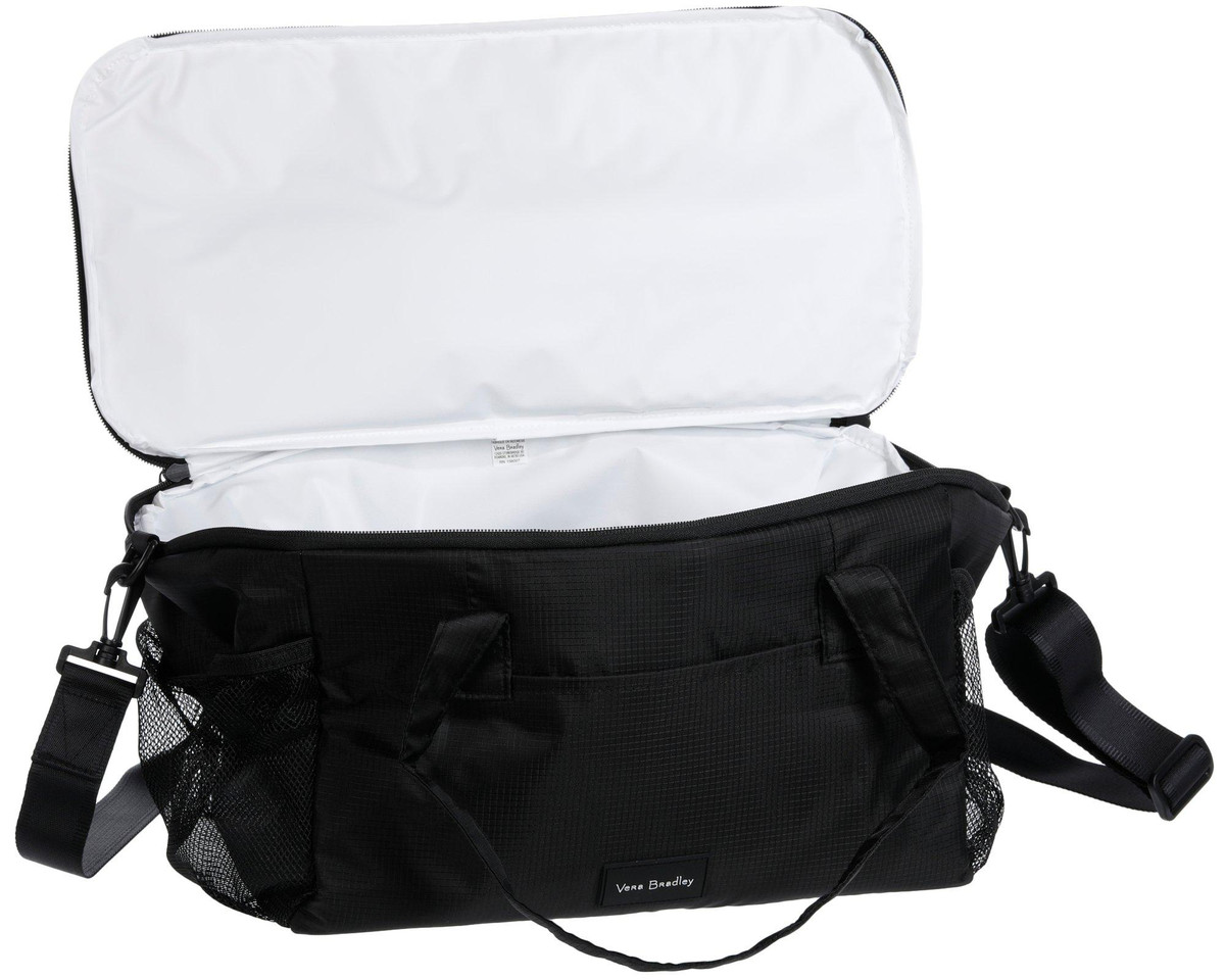The Vera Bradley duffle cooler bag combines style and function with a spacious insulated interior and mesh side holders for added storage. Made from lightweight ripstop fabric, it features a zip closure and removable adjustable shoulder straps for easy carrying. Perfect for picnics, beach days, or travel, this cooler keeps items fresh while offering the convenience of a tote.