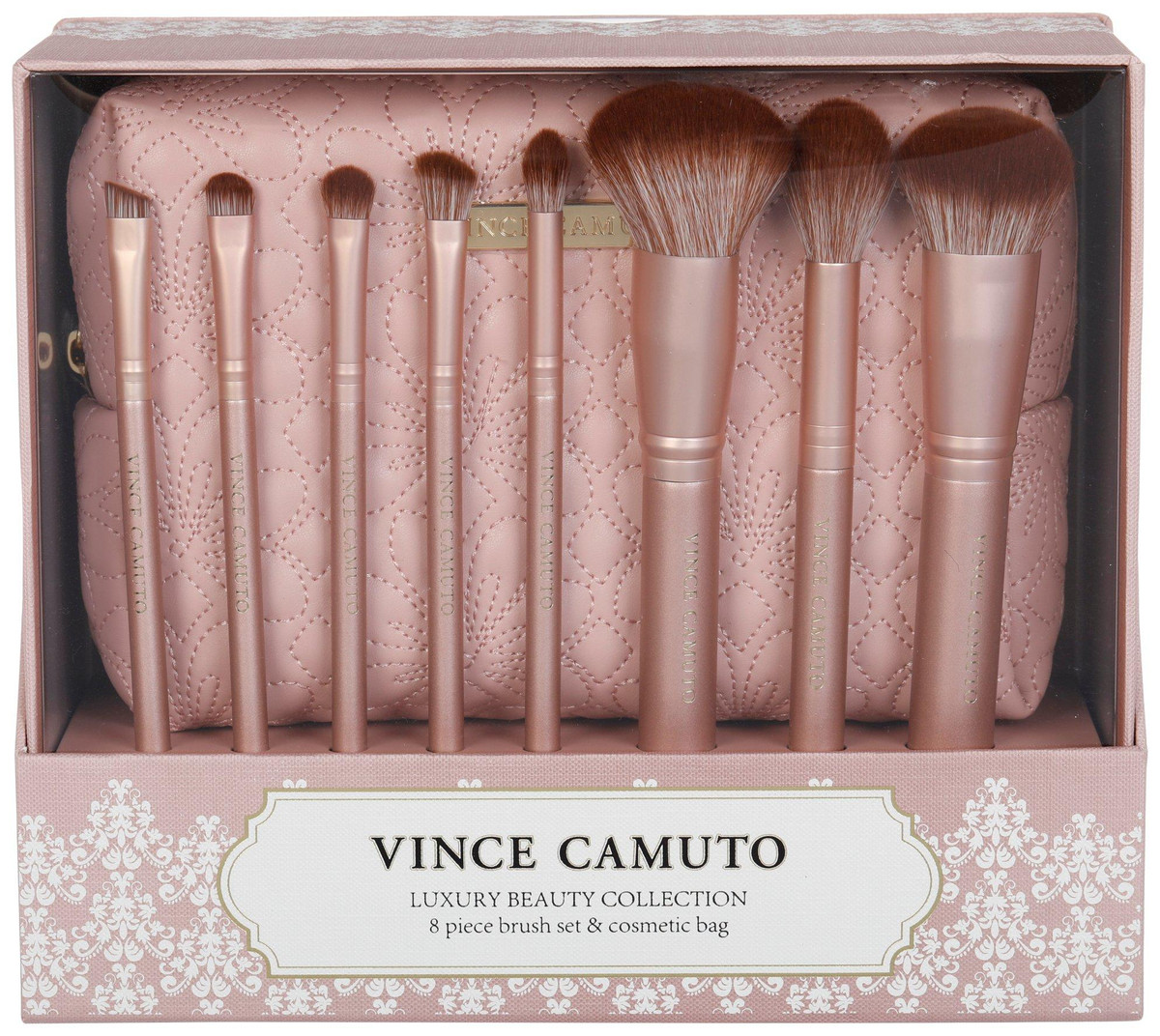 Streamline your beauty essentials with the 8 Pc Makeup Brush Set and Cosmetic Bag. Featuring synthetic brush heads and wood handles, the set includes Brow, Concealer, Crease, Angled Eyeshadow, Blend, Powder, Blush, and Contour brushes. Comes with a gold quilted cosmetic bag for stylish storage. Ideal for home or travel use. Wash brushes gently with mild soap and water, lay flat to air dry.