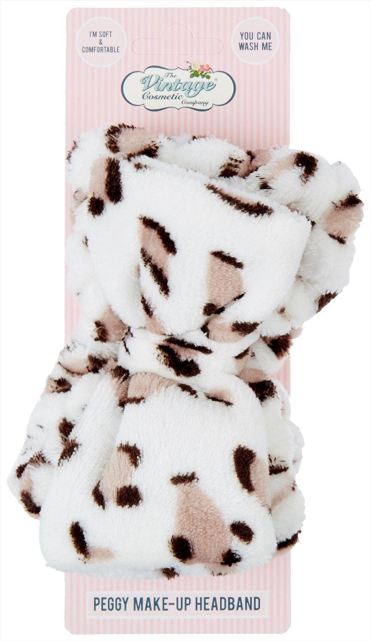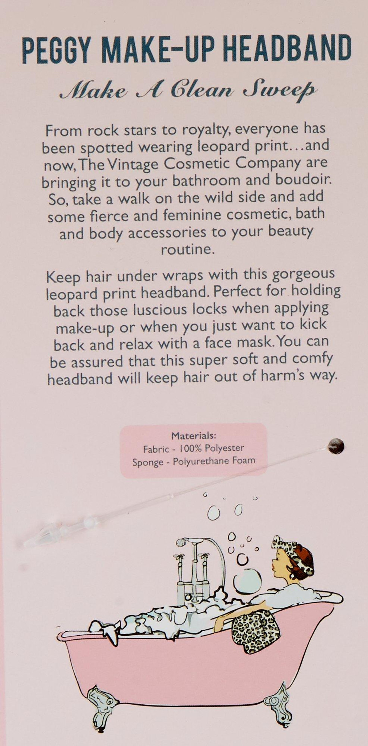 The Vintage Cosmetic Company Peggy Makeup Headband. Perfect for keeping hair strands away from your face as you apply make-up & face-masks. Use in the shower, bath, spa, steam room, hair salon, or gym – any place where you would need to neatly keep your hair tucked in place Made from super-soft polyester toweling fabric with an elastic band that fits nice and snug on the forehead and around your head.